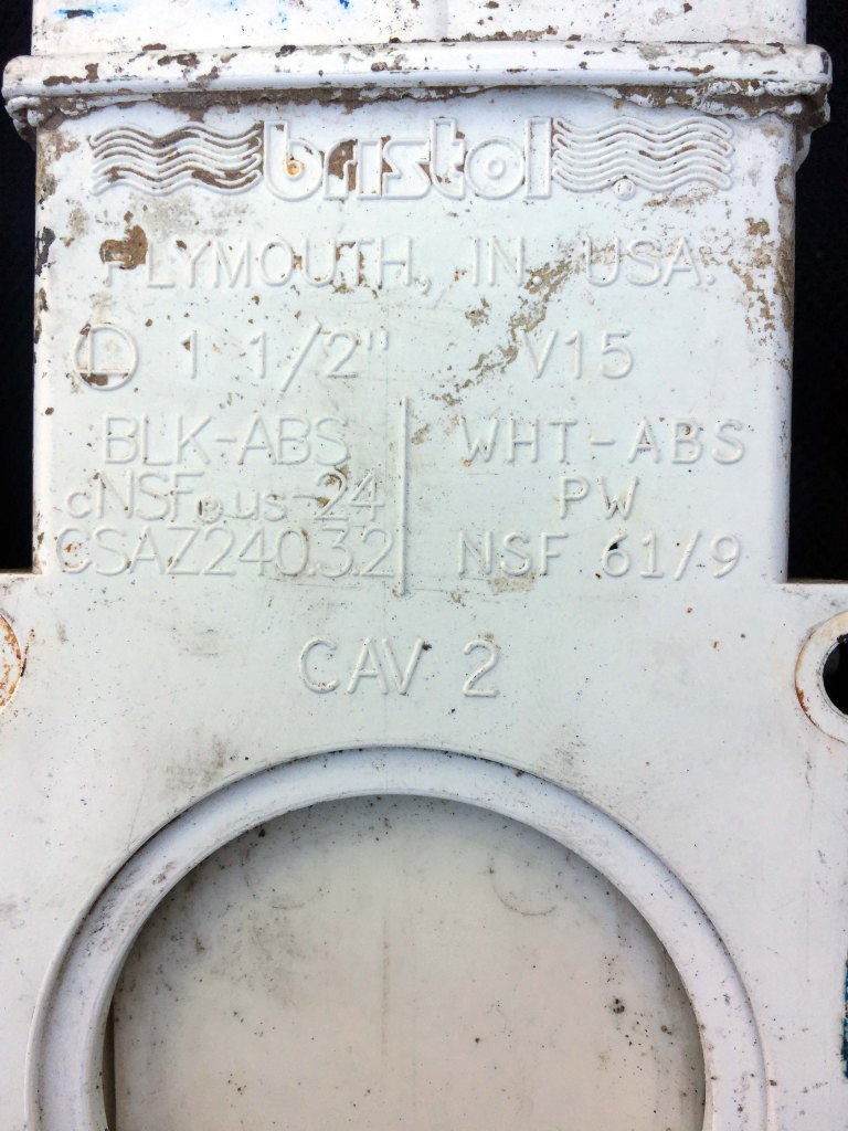 Once I got all the expanding foam and gunk off the old one, I couldn’t see any markings of any kind. I tried using my scope camera and my phone to get a look at the other side, but since it was so close to the tank, I couldn’t see anything at all. So I just sort of moved my fingertips around like a person reading Braille, and sure enough, I could feel the little raised plastic telling me all the relevant markings were there. If I ever meet the genius that installed that thing facing up, I’m going to give him a big hug over the top of his head with a folding chair. I still couldn’t see the markings, and I can’t read Braille, and even if I could it wasn’t written in Braille, so I had to remove the bolts and take down the valve just to get the information. Hey, remember in the last post where I filled up the tank to flatten it out. Yeah, all that water had to come out before I removed the valve. So I got a sewer hose and put it just below the outlet and hung it with some tiny bungee cords and pulled the valve handle. The alignment was off a little, so I got drenched. Remember, this is why I am doing this in the first place! Once the water was finally drained, I got to work taking off the bolts that hold the valve to the fittings. Of course those aren’t stainless, and being under the rig and completely unprotected, they were very rusted. The first one came out OK, but the other three all broke when I tried to remove them. Luckily, once they were broken they just fell right out. With the lower fitting and the valve free (the upper fitting still attached to the tank) I was able to get a good look at the thing, to see who made it and model # and all that.
