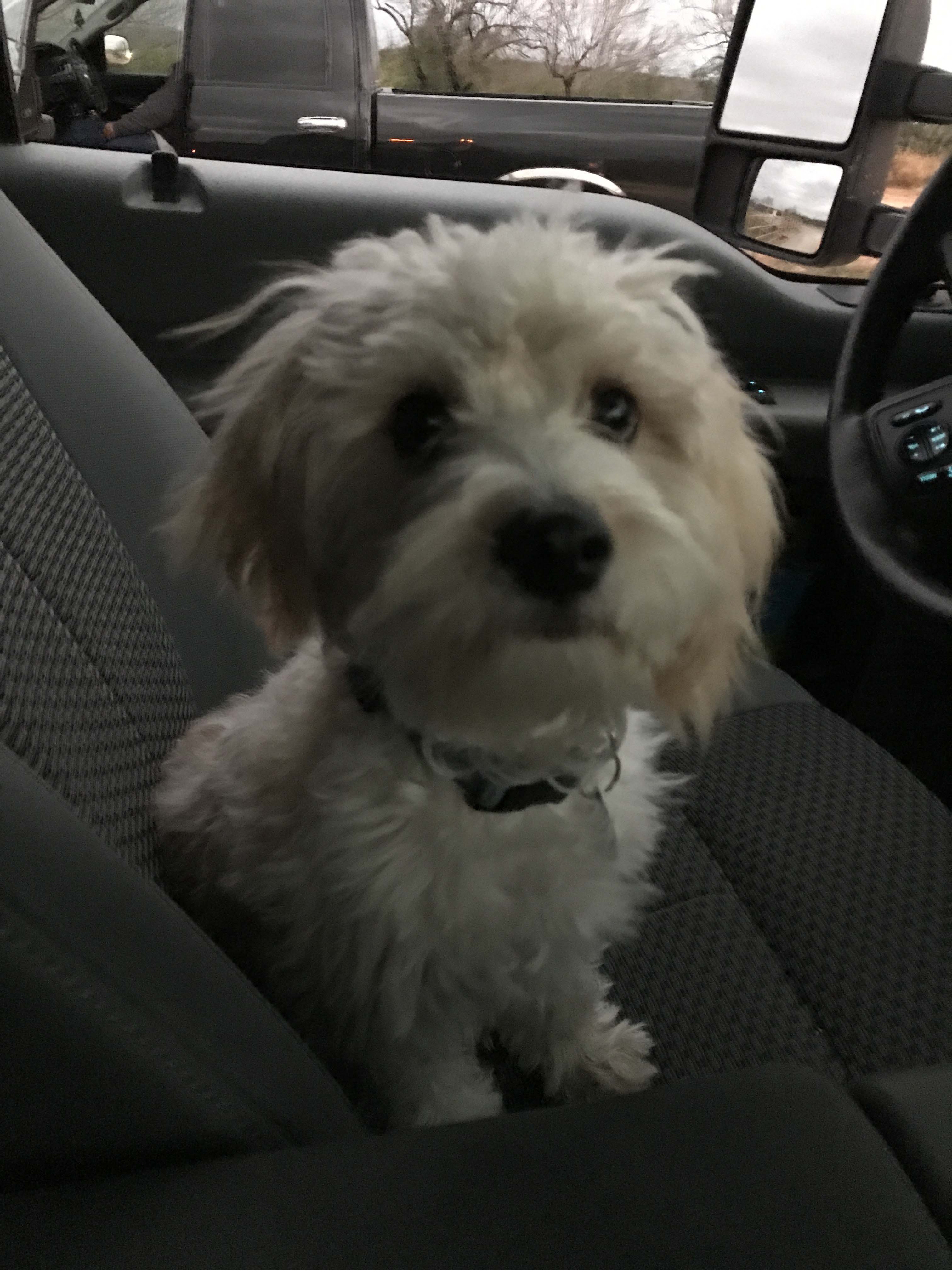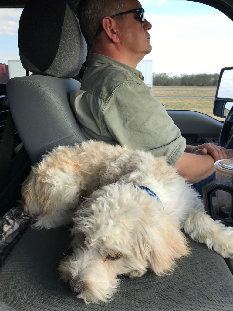 We found time to play a little before we left and then got into the car. The ride in the truck is much rougher when we are towing and the roads in San Antonio are in pretty bad shape from construction. He did OK, no throwing up thankfully, but we were unable to get him to go to the bathroom when we stopped at a truck stop. So far we have never been able to get him to go, since he seems overwhelmed by smells, but thankfully he has a good bladder and so far not an issue. I was more worried when we finally made it to the general area of the gate because we had a 20 minute wait on the supervisor to show us the way and still couldn’t get him to go.