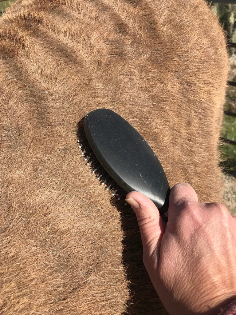 Today Linda had myself and Jo (another newbie) and she walked us through her process. We went to a stall and Linda walked in and showed us how to groom them. She uses cookies (animal crackers) to treat their good behavior and most of them like being petted and brushed. A few though would take the cookie, but didn’t want to be touched so we just talked to those in the hopes they would be less shy in the future.