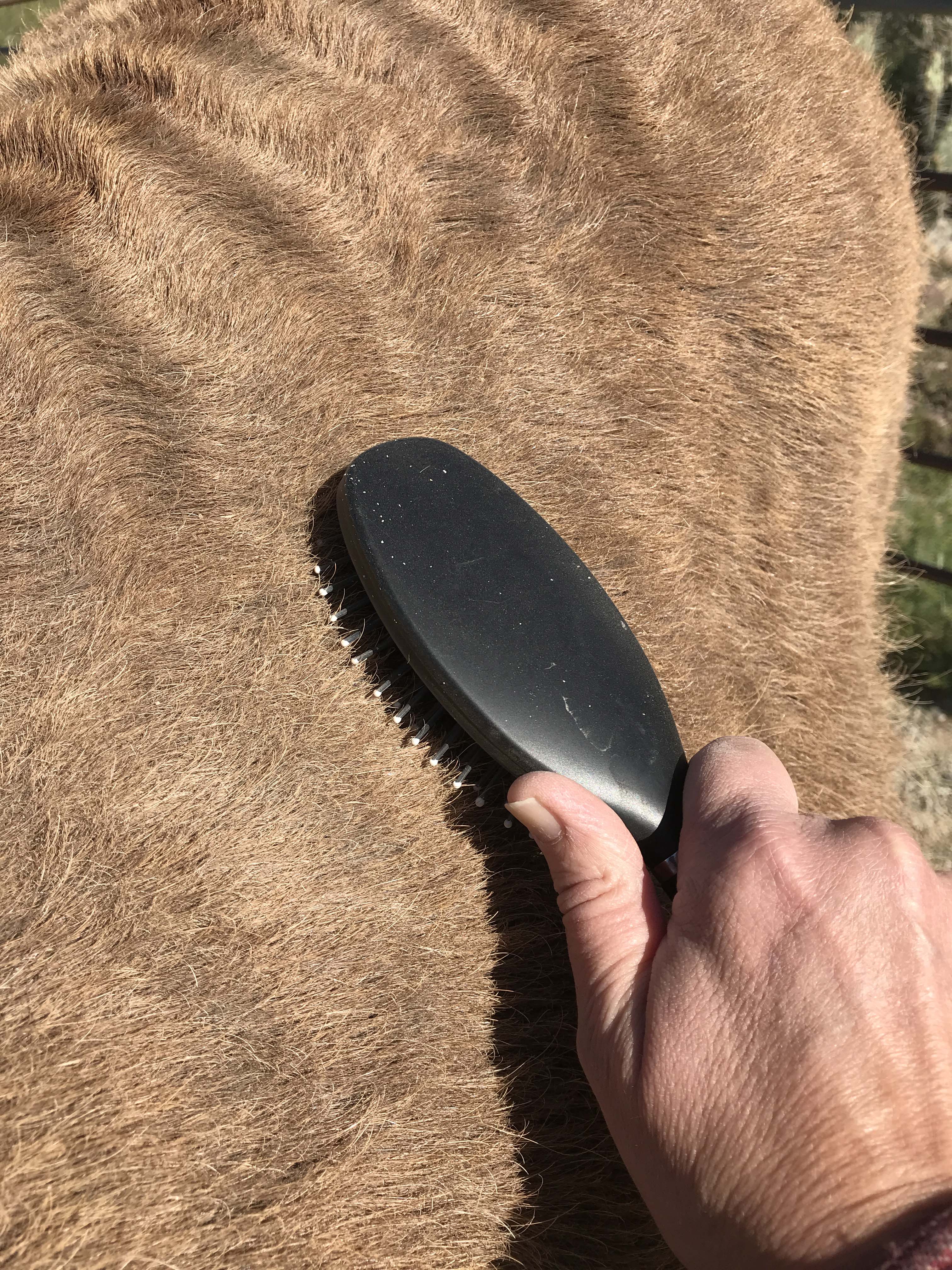 Today Linda had myself and Jo (another newbie) and she walked us through her process. We went to a stall and Linda walked in and showed us how to groom them. She uses cookies (animal crackers) to treat their good behavior and most of them like being petted and brushed. A few though would take the cookie, but didn’t want to be touched so we just talked to those in the hopes they would be less shy in the future.