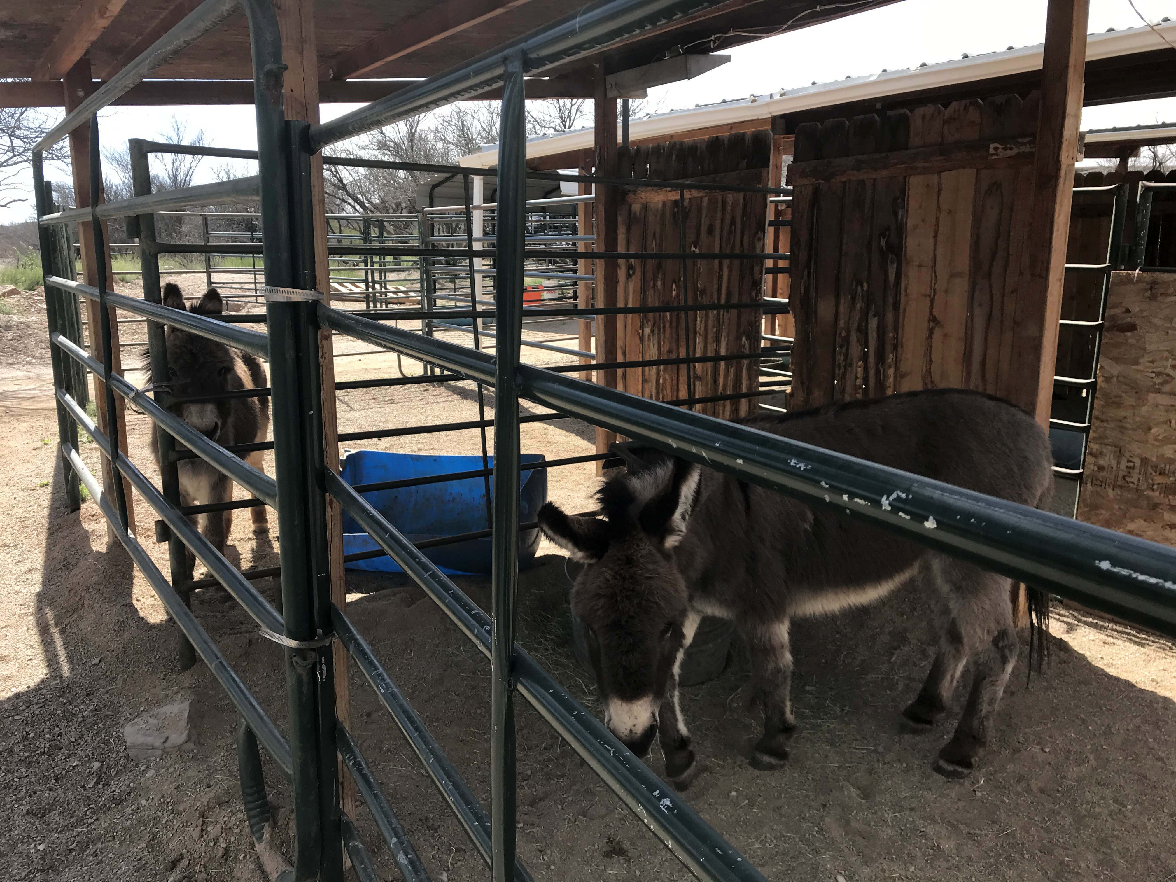 One donkey waiting for his buddy who is a slow eater. He stood there patiently until he was done, which was really cute.