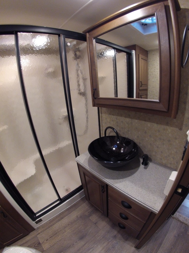 The one really good thing we did do was upgrade to a larger toilet.  I hated the small toilet that came with the RV and the larger porcelain one was a HUGE improvement.  This upgrade still make me really happy and I would never own another RV without having this changed. It’s that big of a difference.