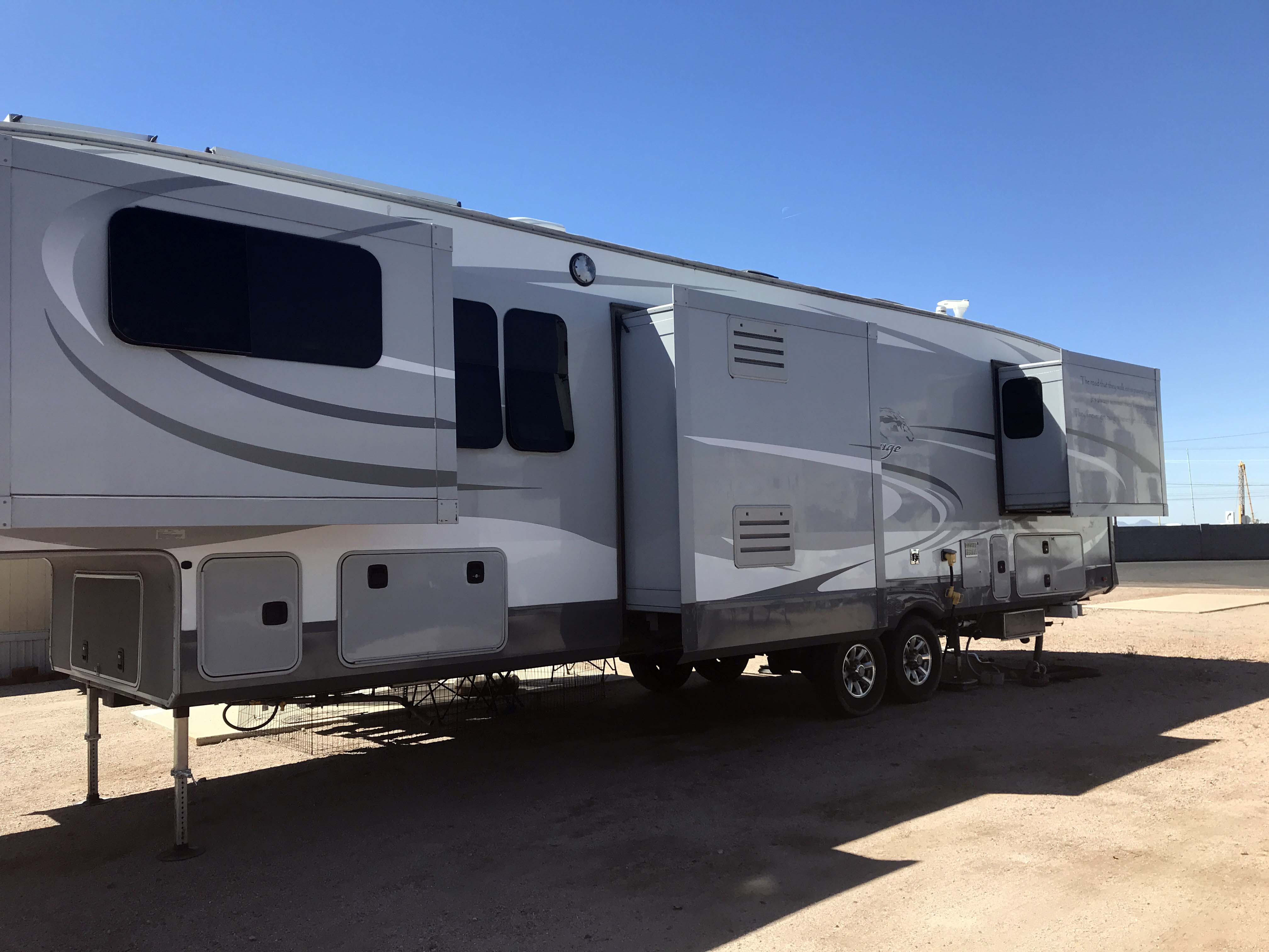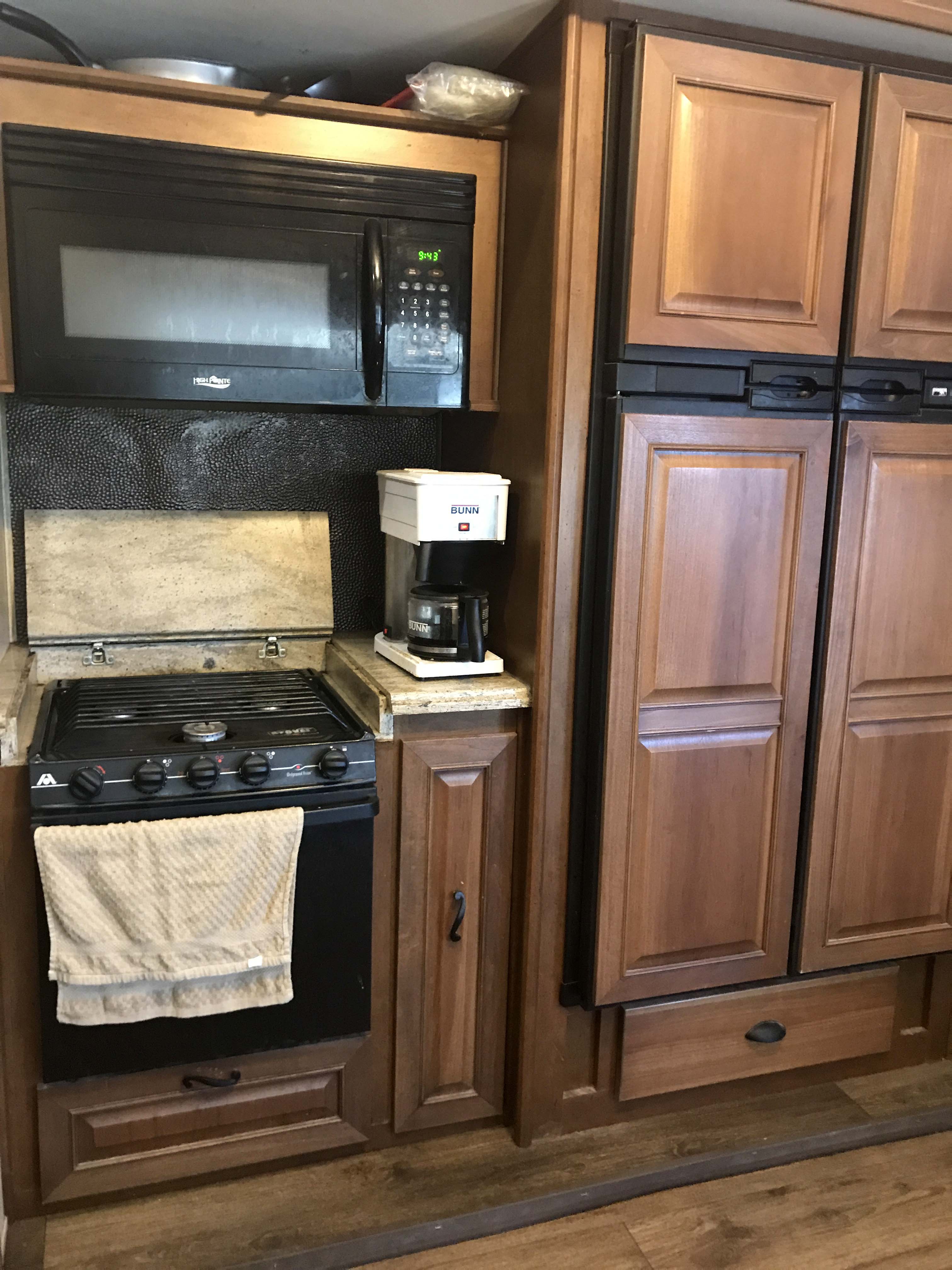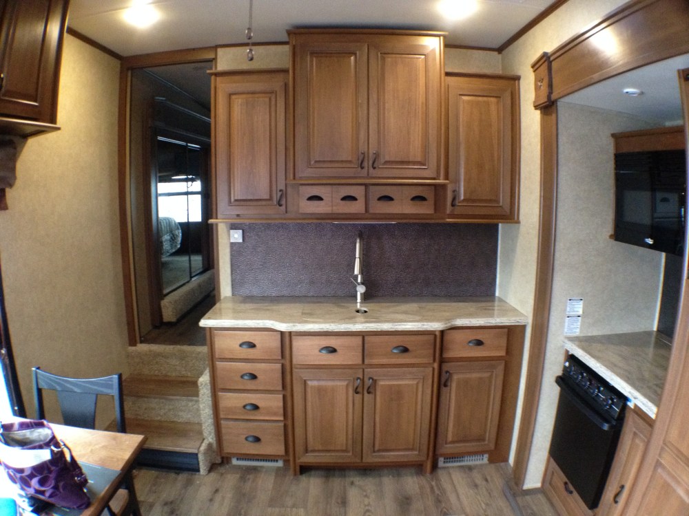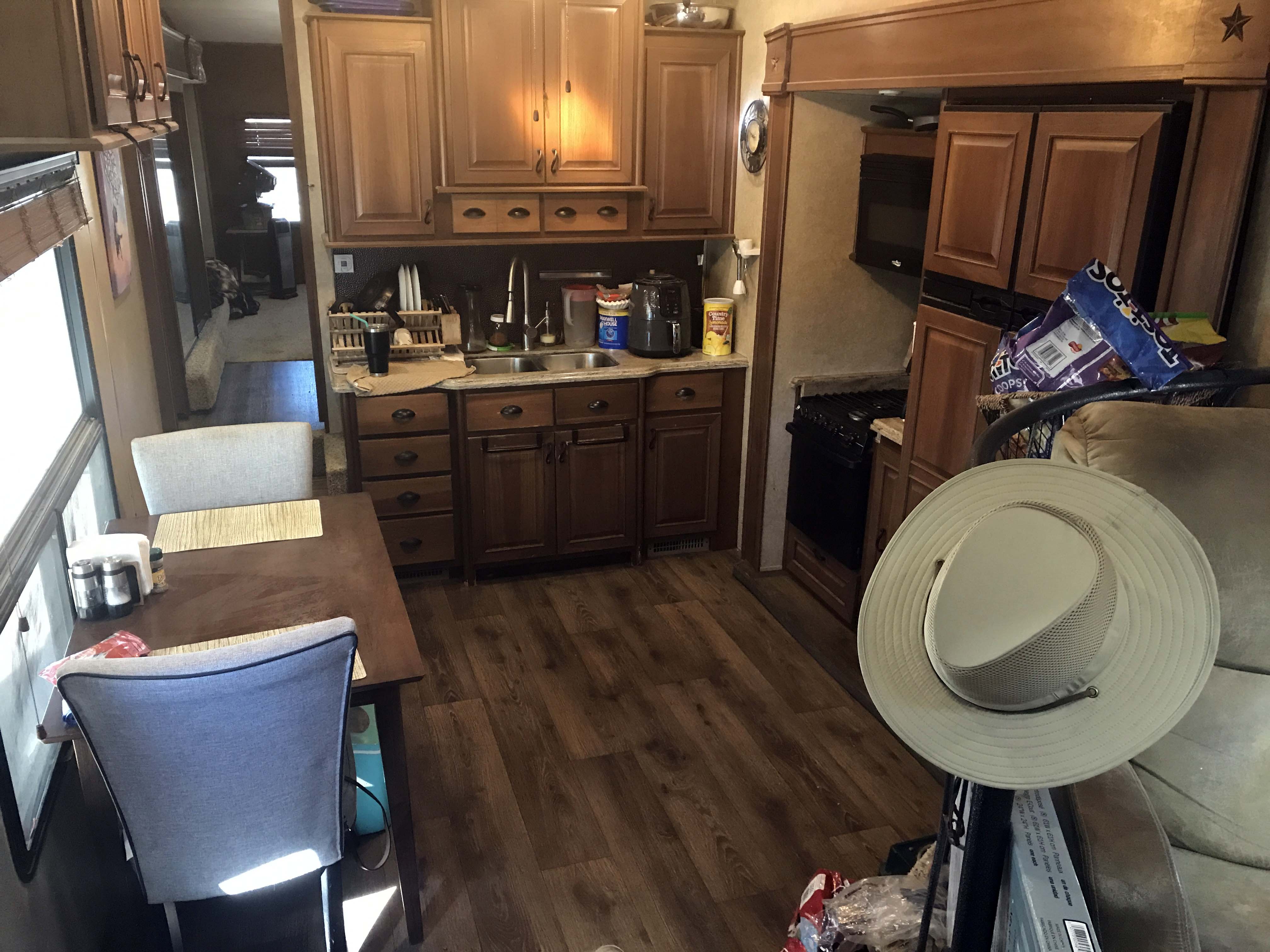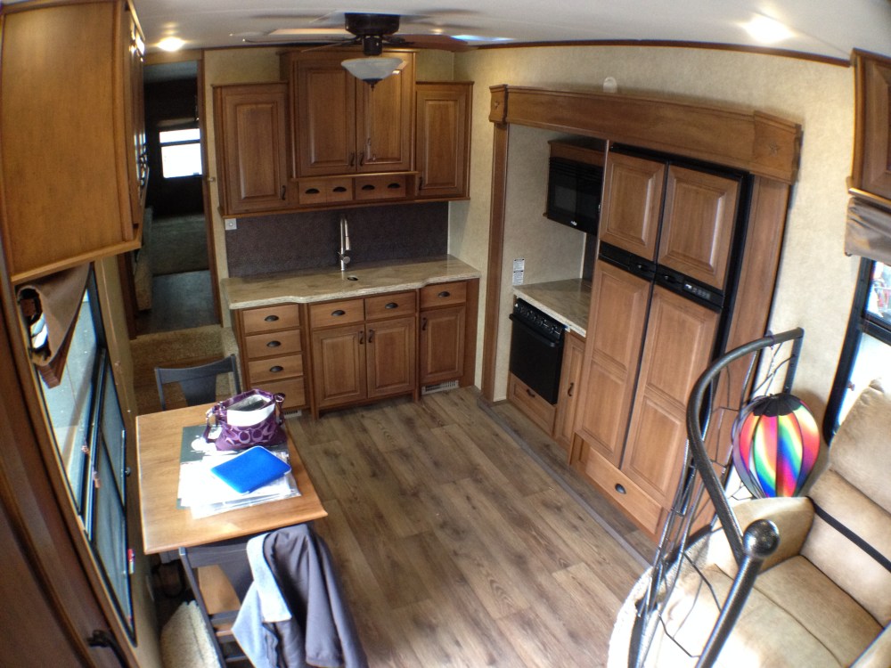 One of my big questions before embarking on this lifestyle was how well will the average RV hold up.  There are a few high-end brands that are specifically designed for the full-time lifestyle, but we like many other people bought a middle tier RV and have adapted it.  In five years we have put over 40,000 miles on the RV.   It’s definitely been road tested, although we have also spent long stretches just sitting in one place for our summer jobs.  To answer the question on how it has held up, I am going to show you the before and after pictures and talk through some of the issues  we have had.  I will also discuss the enhancements and you can find details on how Lee did them on our DIY Mods Inside and DIY Mods Outside Pages. I can still remember picking it up and how shiny and clean everything was.  Obviously the place is lived in, the pictures will show that, but cosmetically it has held up much better than I expected.