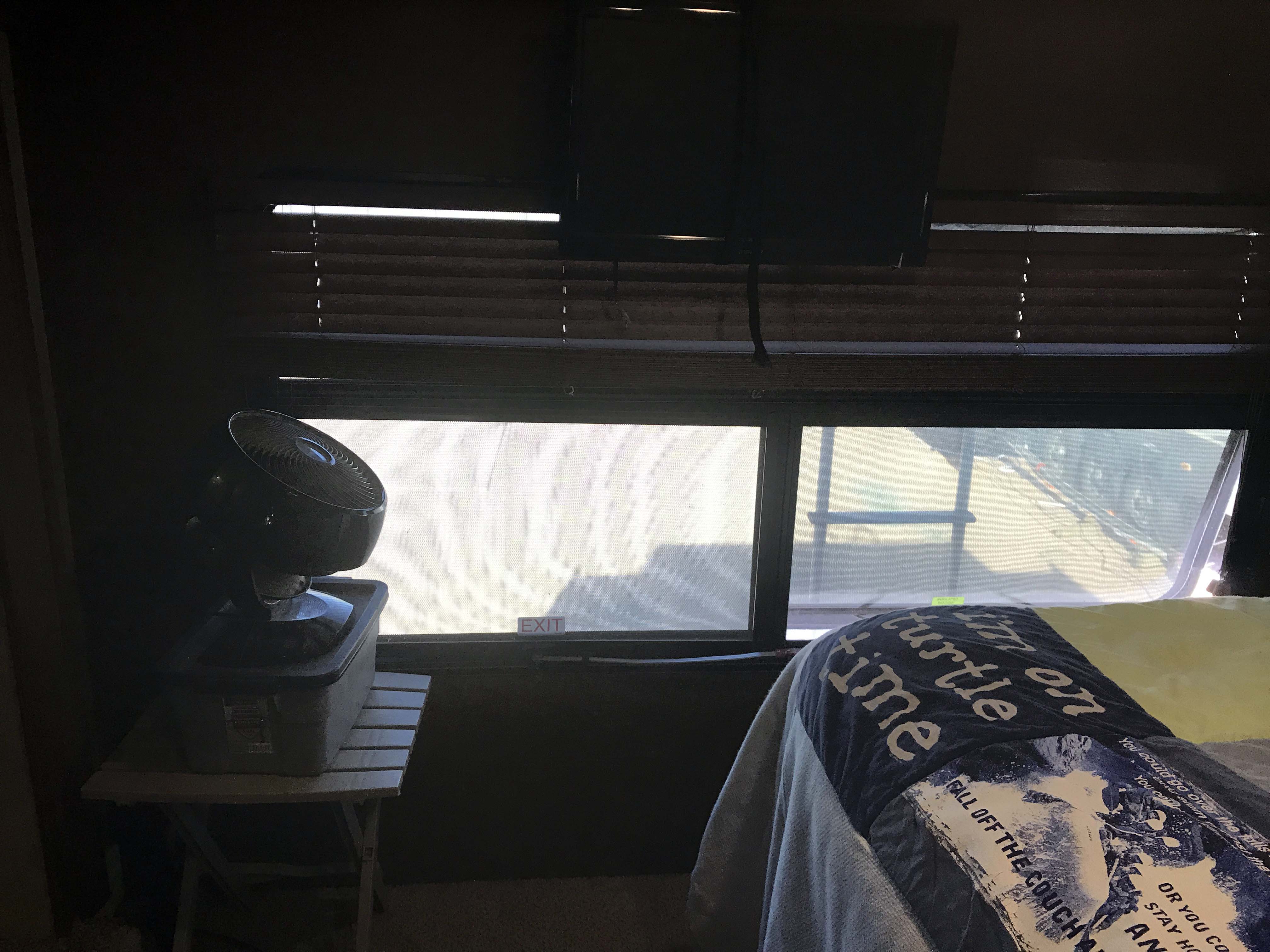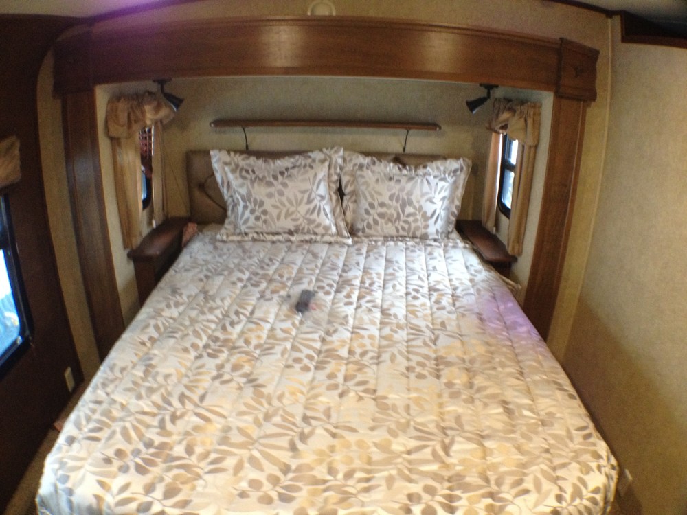 Let’s start in the bedroom, which has probably changed the least.  The RV came with basic bedding and absolutely horrible valances.  We removed the valances right away, with the vague idea Lee would build something custom and I would make something to cover them.  Neither of those things happen so the blind hardware has been bare this entire time.  Honestly it rarely bothers me and I personally am still a huge fan of the wooden blinds.  Yes they get dusty, but I have never been a person who cares that much about dust.  I will say that little shelf in the back does catch a ton of dust and really doesn’t serve any practical purpose.  The two side night stands are used every night though and I would never have an RV without them.