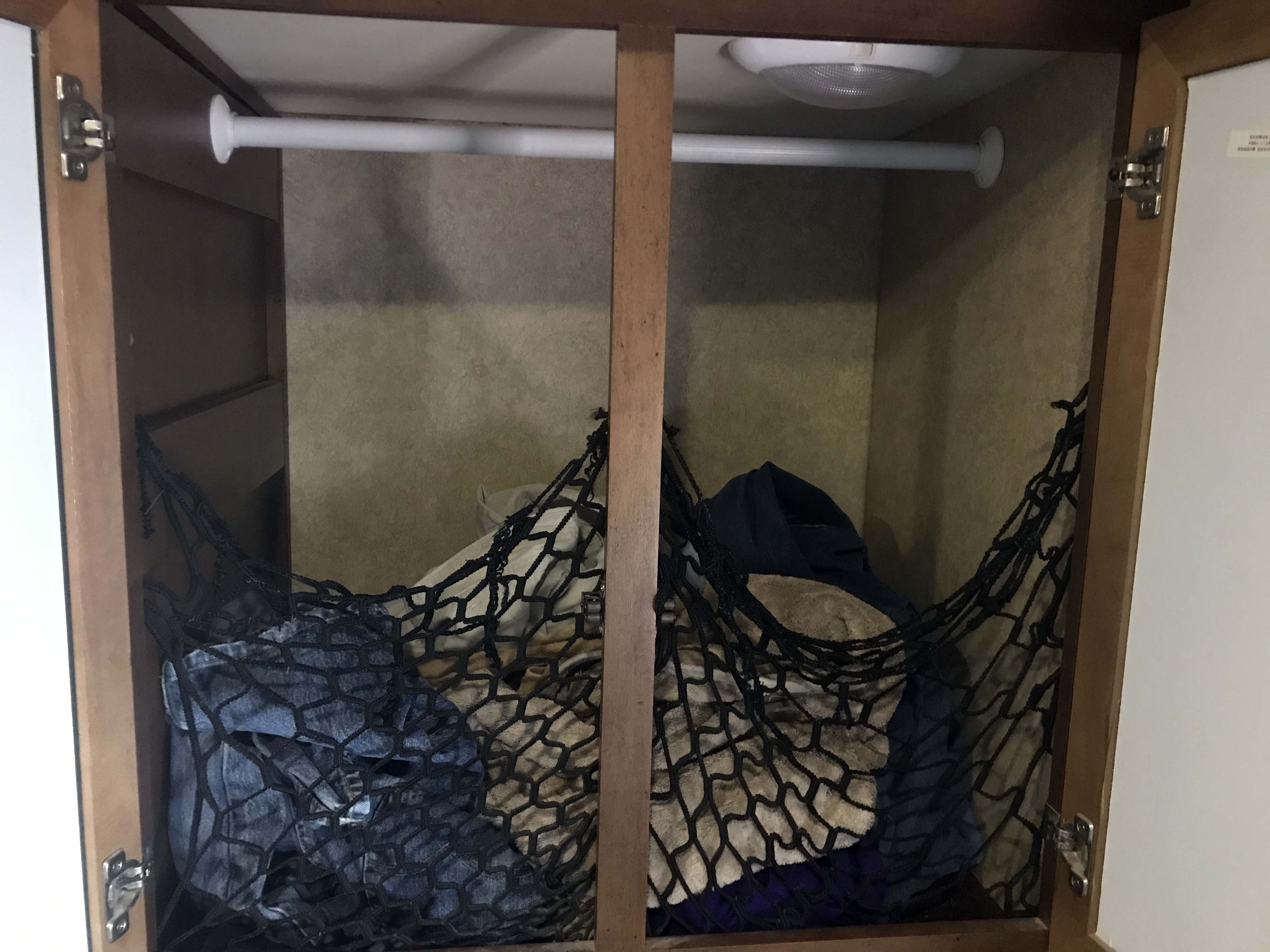 One of my favorite mods is how he turned part of the closet into a laundry hamper with netting. The laundry hamper solution is a challenge in almost every RV and this really works for us.