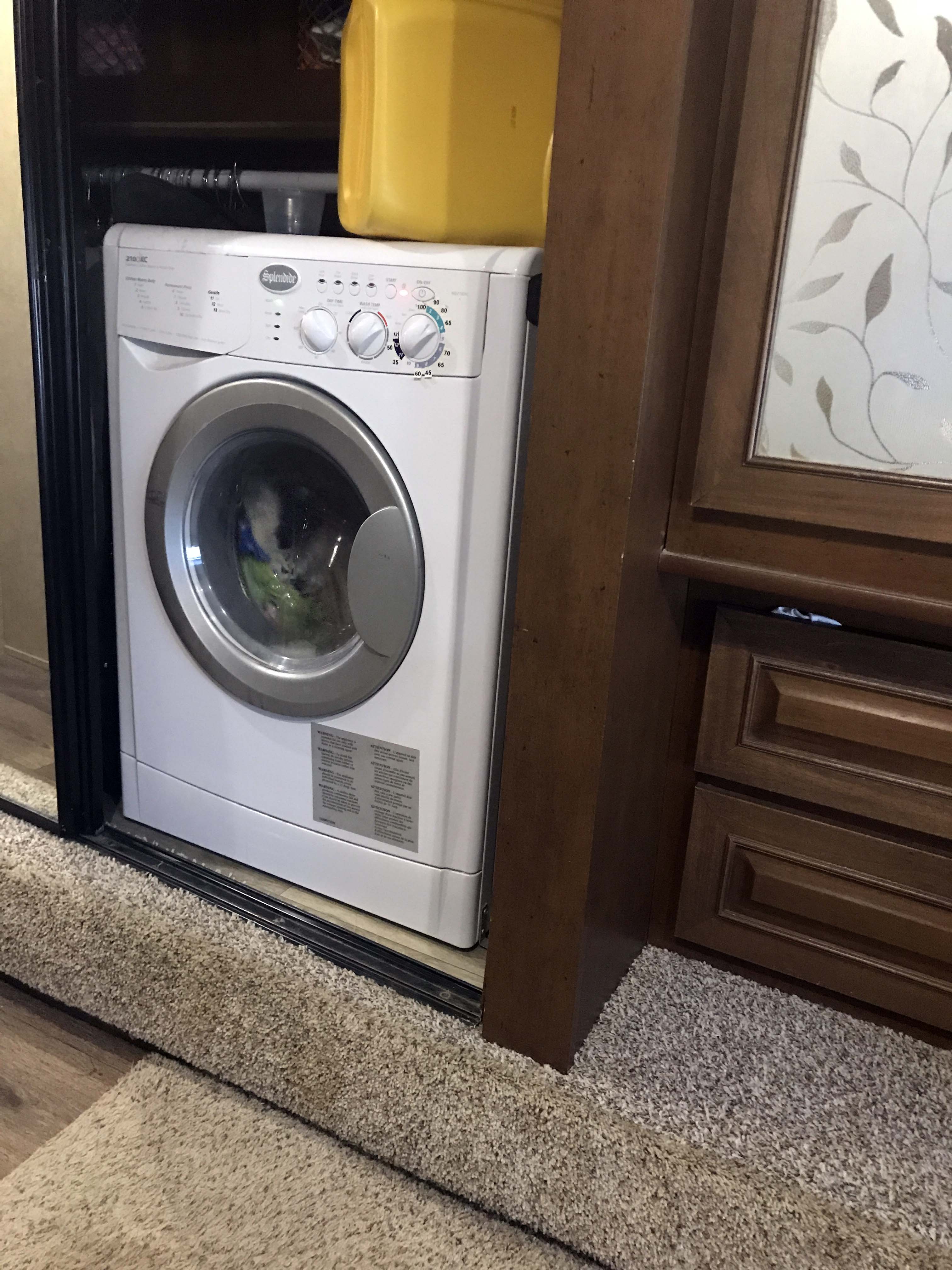 We knew from the beginning that we wanted a washer/dryer combo and we are so glad that we have it.  We use the washer dryer all of the time and only go to a laundromat when boon docking or for our blankets etc.  Unfortunately the first unit we got with the rig never worked right and we needed to use our extended warranty right away.  We had technicians out twice before they finally received permission to replace the Pinnacle with a Splendide.  I will say we occasionally have issues with it when we are on unusual power.  It’s not just us, Greg and Cori have had similar issues, but mostly it works great and we feel lucky to have it.  Would never get an RV without one.