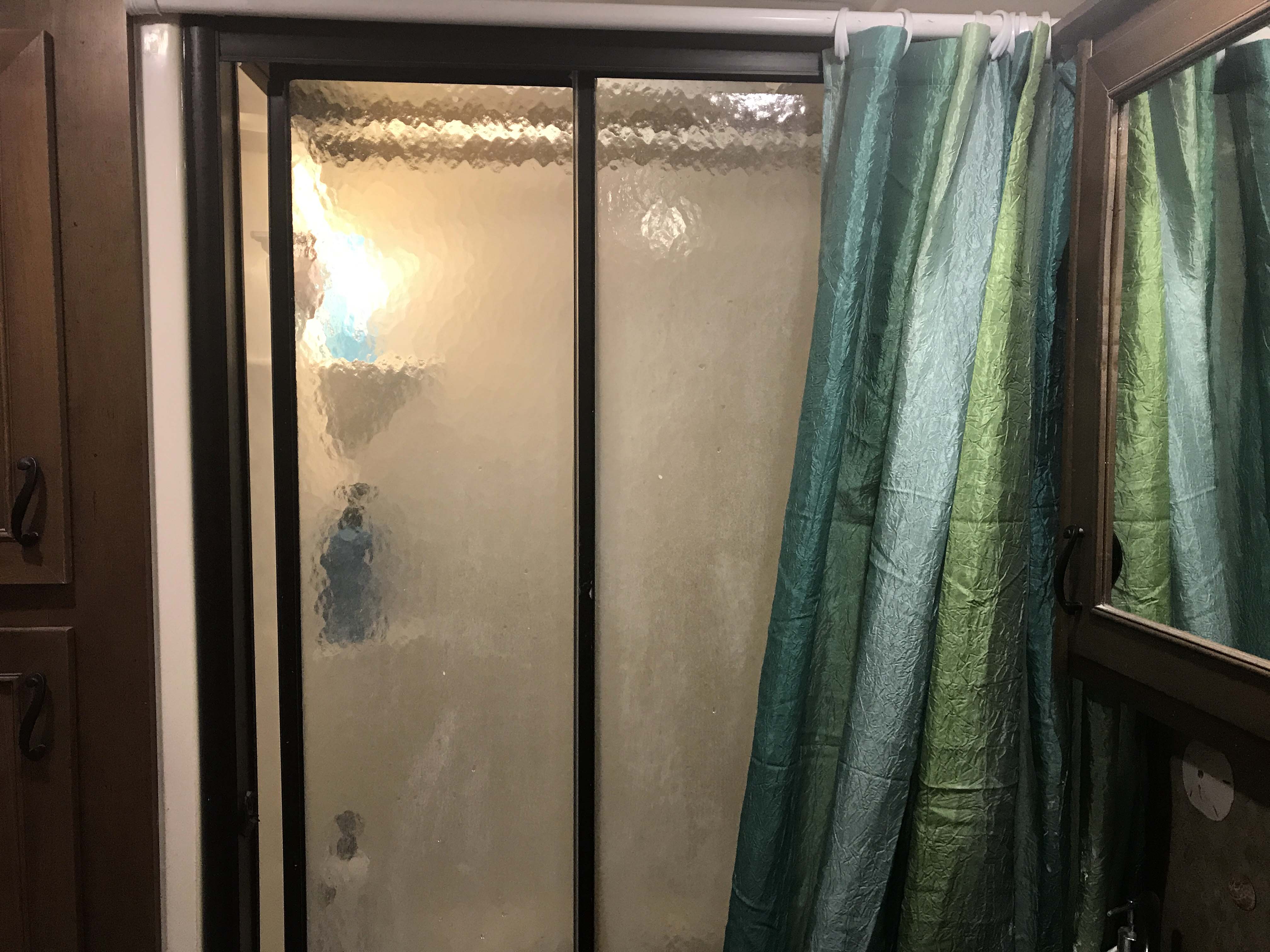 Of all of the rooms I would say the bathroom is the most beat up.  Not surprising because it sees a ton of use and also because I find it very hard to clean in there.  My claustrophobia is mostly a non-issue in the other rooms, but I tend not to spend a ton of time in there. The shower itself has some nicks at the base and the doors are pretty bad.  The glass is cloudy and in the corners it has mildew etc.  Lee and I have both tried to get it clean, but without completely taking off the doors at this point I don’t think it is possible.  Instead I took the route that many others have and added a shower curtain.  When company comes over I just pull the curtain closed so no one sees.