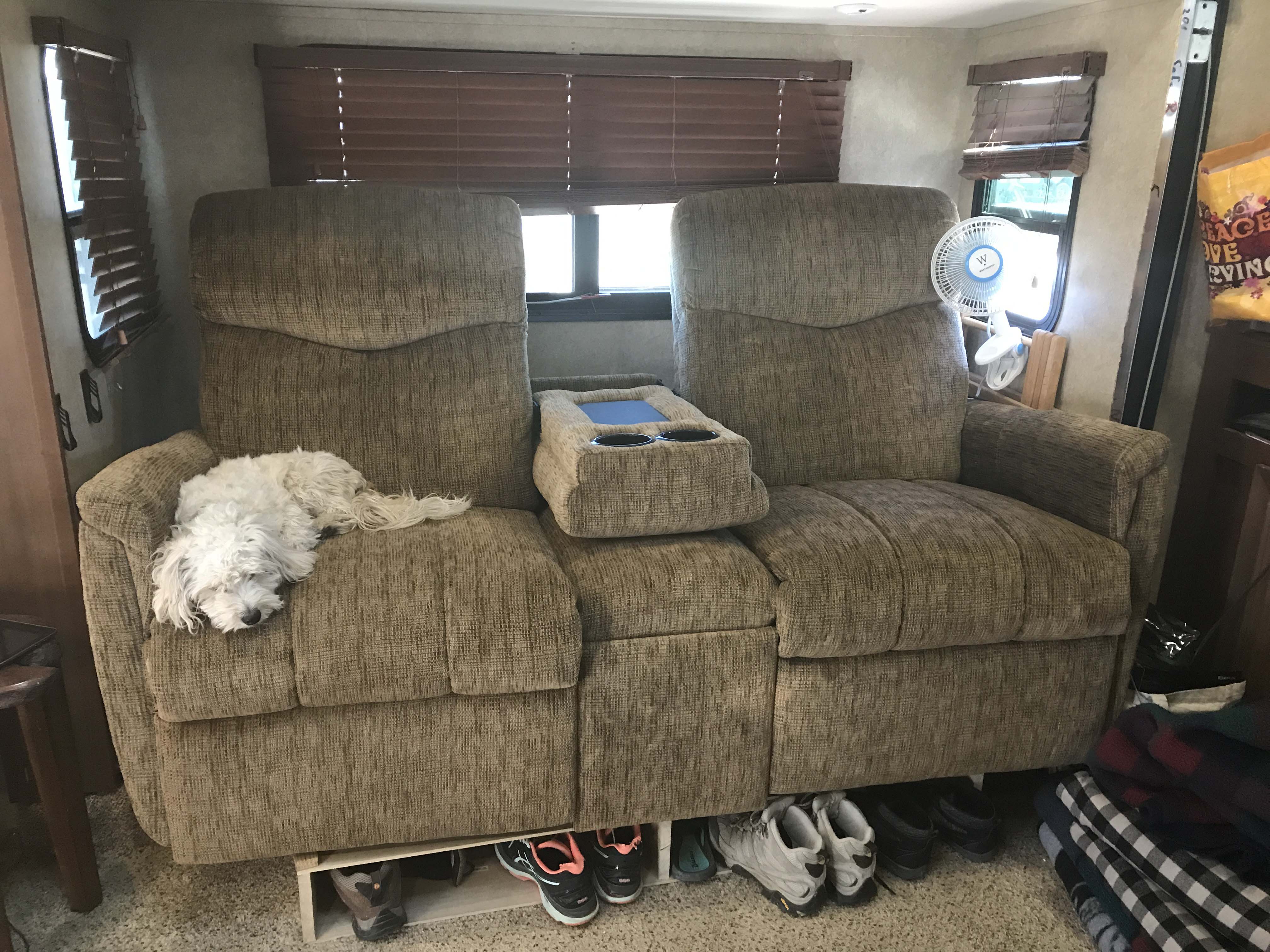 We bought out second couch before we even went on the road but it was just a standard loves eat.  Once big problem was the back covered the windows which significantly reduced our airflow. It was comfy though. Our current couch breathes better and has slightly shorter backs.  It also has a center section that comes down allowing for more airflow.  Because it gets so hot up in that corner we have also added a small fan which helps. Unfortunately it still sticks out and Lee built a second base for it to rest on and this time built-in a shoe cubby which is nice.  The only downside is you still can’t put your feet on the floor which is awkward when guests come over.  I usually have it reclined so it doesn’t bother me.