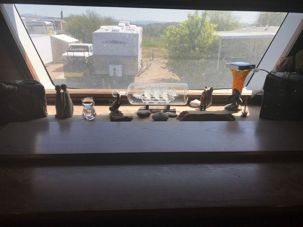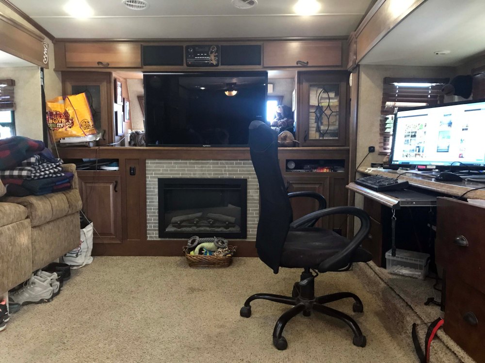 As you can see in the next picture we intentionally had the second couch left out.  Lee knew he wanted to build a desk and that has been absolutely awesome.  He added a slide out keyboard mount later, which really improved the design and all the details on how he did it are on our DIY page.  One thing I loved when I initially bought the RV was the front window. I still like it but because it has a structured screen print on the front it is very difficult to clean.  Dust and bugs also hang out in that section and it’s hard to get back in there.