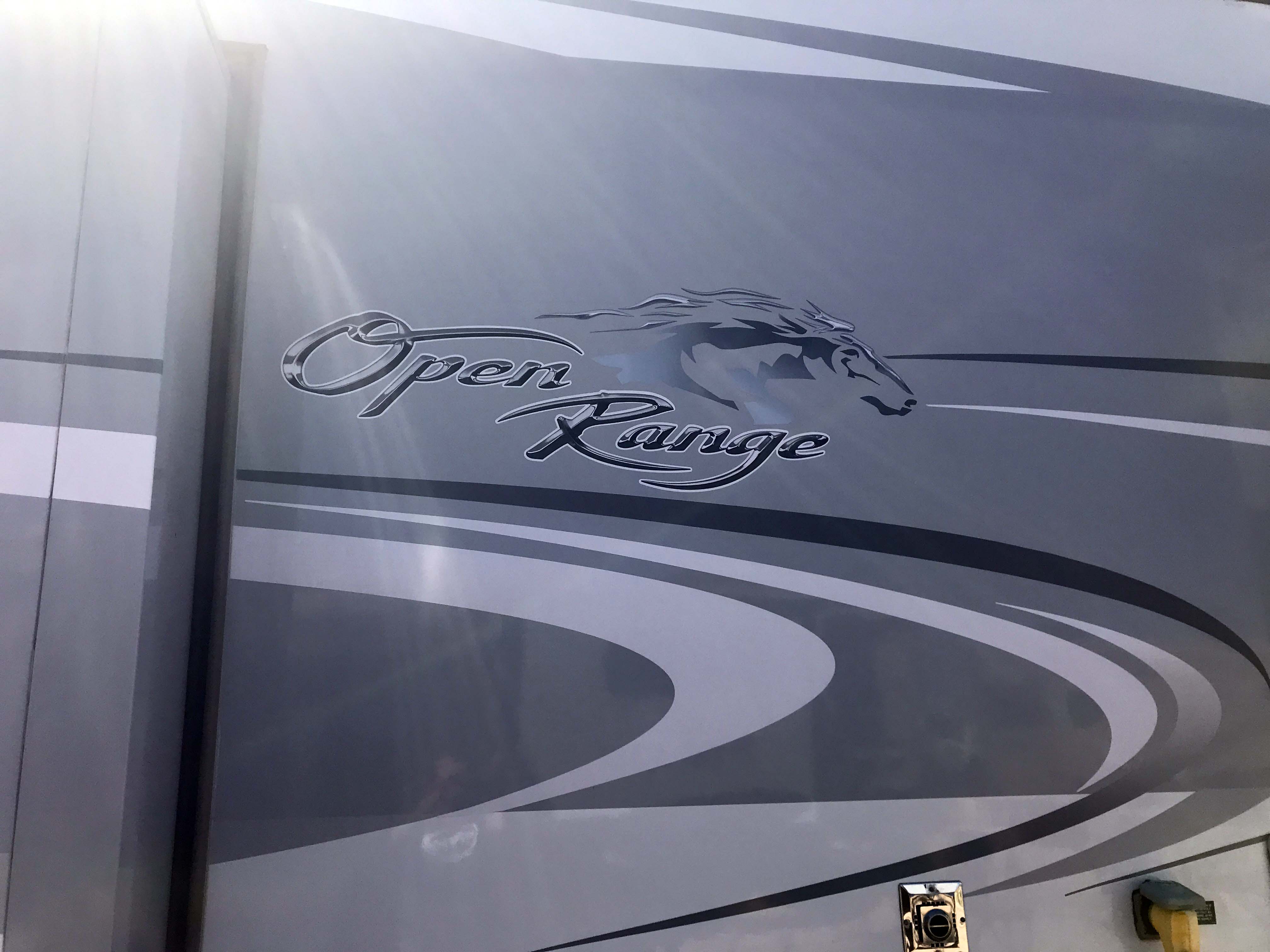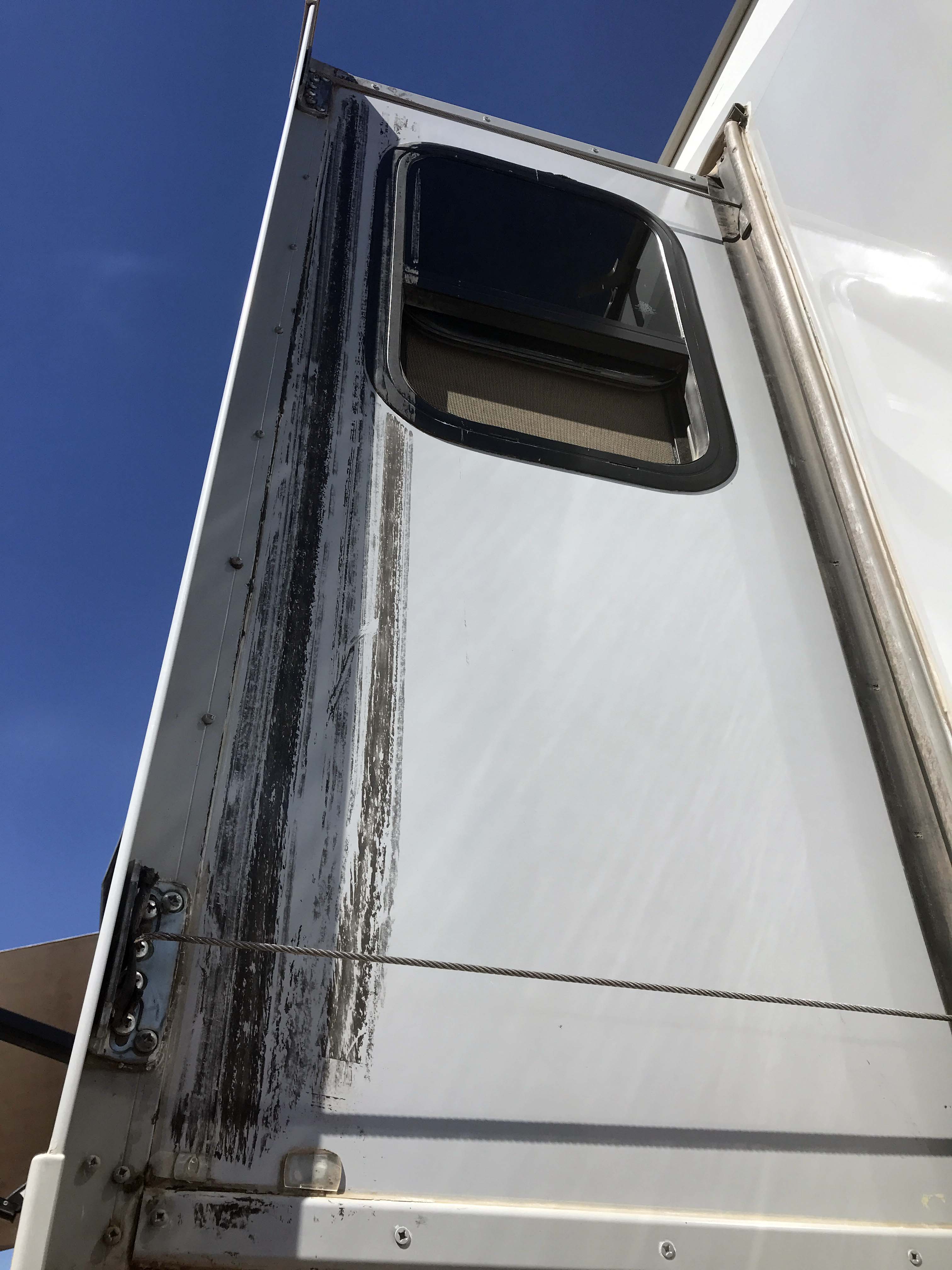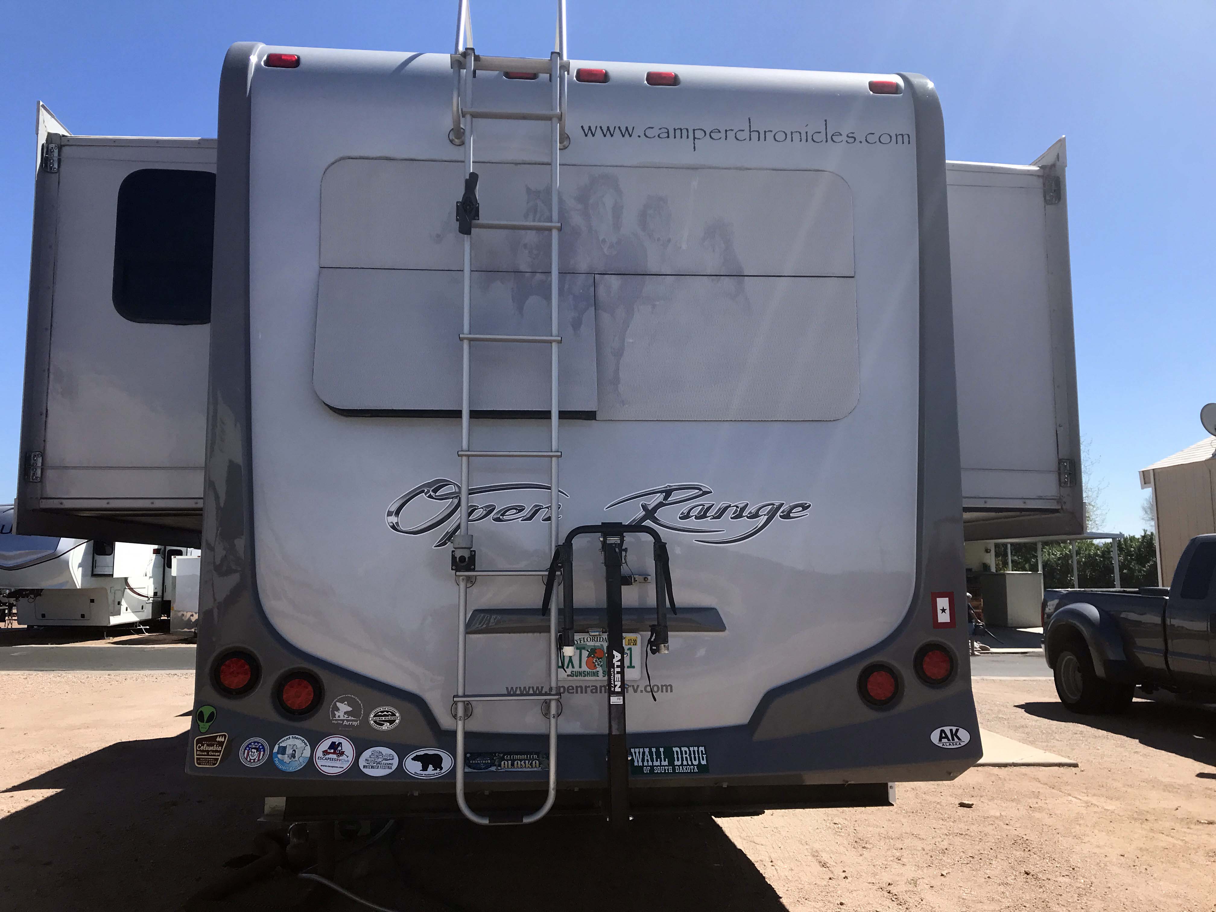Speaking of structural defects it is time to talk about the outside.  Lee is working this week and unavailable to add to this post, so I will do the best I can hitting the highlights.  As you can see below everything was bright and shiny when we picked it up, but of course are a little more beat up now. the main cosmetic changes are that Lee removed the swirls from the windows, which I really appreciated because it opened the window up.  The logos on both the front and back windows are also getting a little faded but this seems to be a common problem with older RV’s.  We like the way it is fading though because of the light colors it really doesn’t look that bad.  We actually are very glad we have a light-colored RV.  It hides the dust better and the paint doesn’t show fades nearly as much.  The only thing we have added is our blog logo on the front and a quote on one of the slides.  They are getting a little frayed as well, but holding up ok.