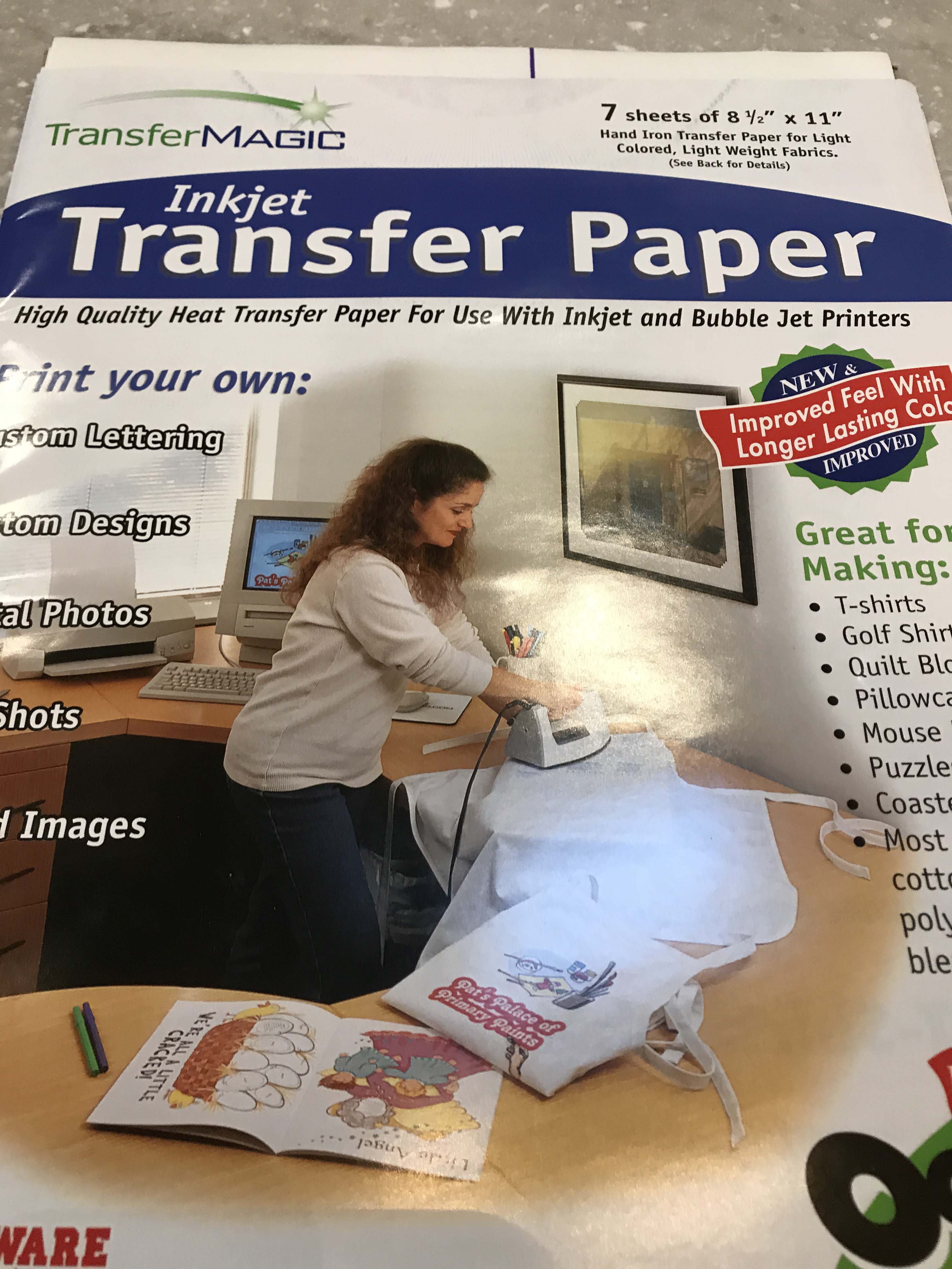 Next we decide to try transfers. I had purchased both Fusible Cotton Fabric Sheets and Inkjet Transfer Magic paper because I wanted to try both and see how they impacted the clothes. I went online and searched for free patterns and after some digging I found several. Unfortunately I didn’t understand that the cotton fabric sheets are ironed right side up on the shirt and wasted a sheet by printing them in reverse. The Transfer paper has to be a reverse image, but this was very easy to do by selecting the Mirror Image box under advanced printer settings.