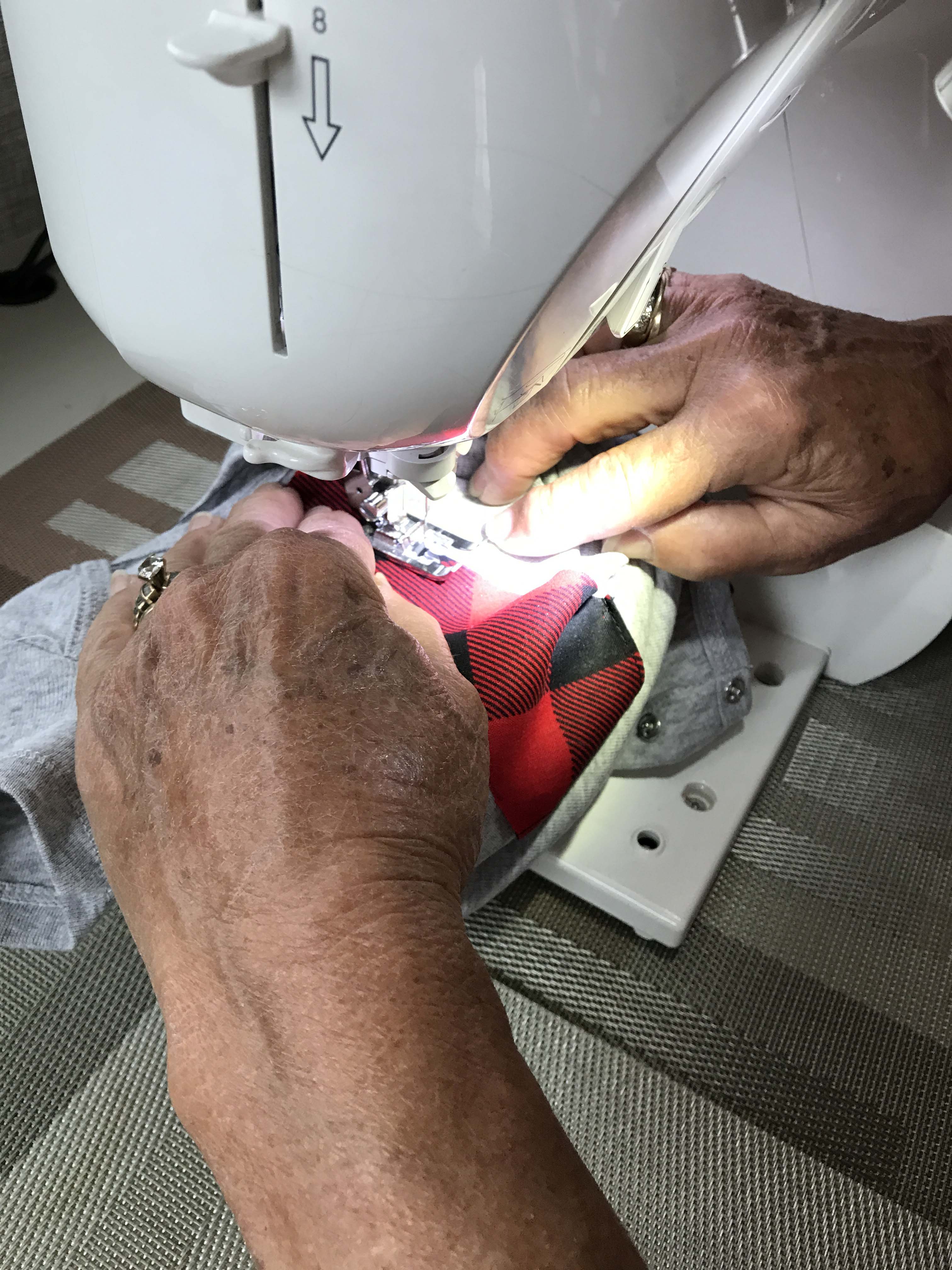 After finishing the patches we decided to tackle two more difficult designs that required sewing. I saw these really cute pictures of onesies, but I didn’t think I could do it alone First I went online and found templates, and then printed them and cut them out. Sue cut the fabric to match the template and we used steam a seam to hold it down.
