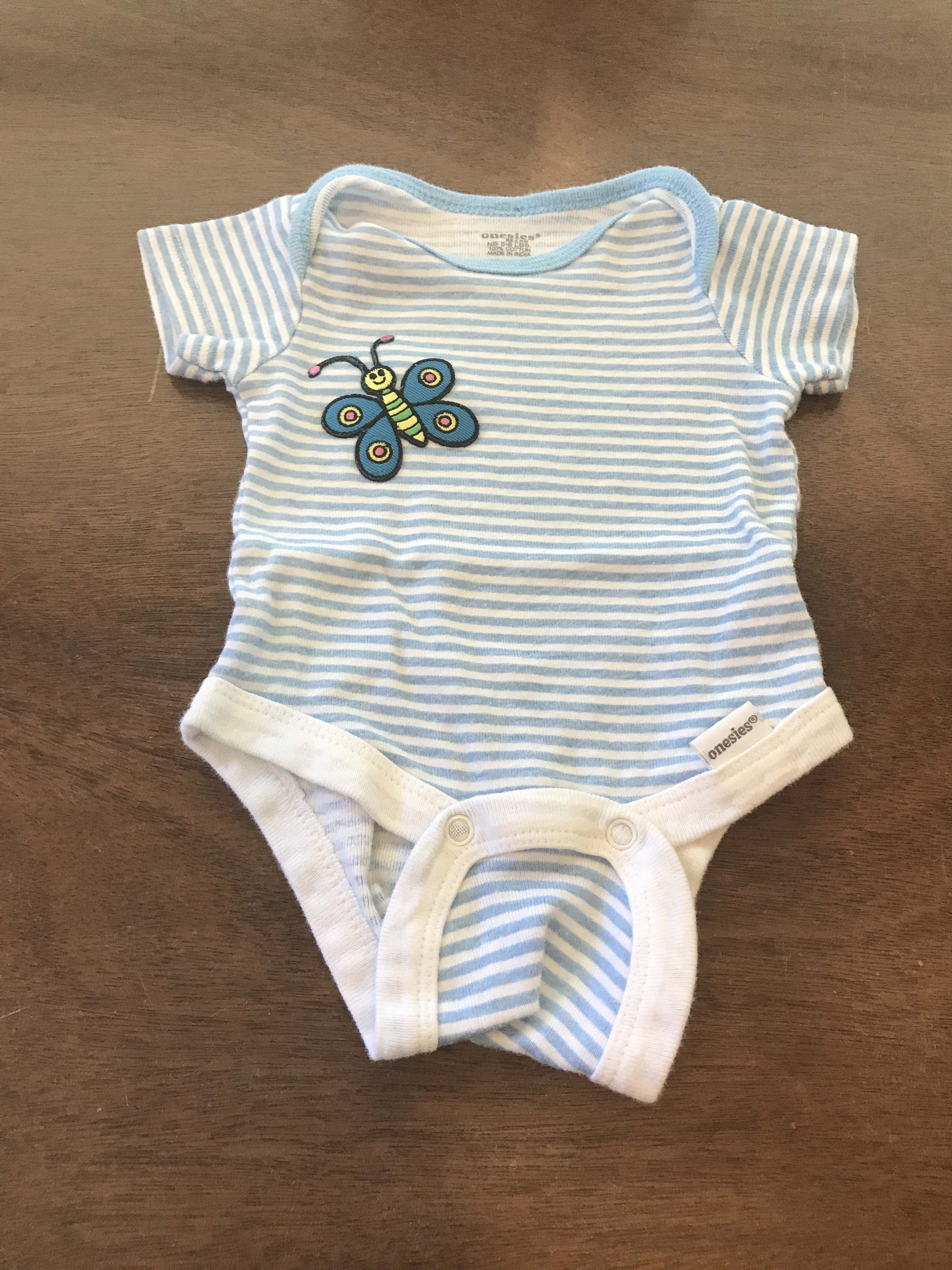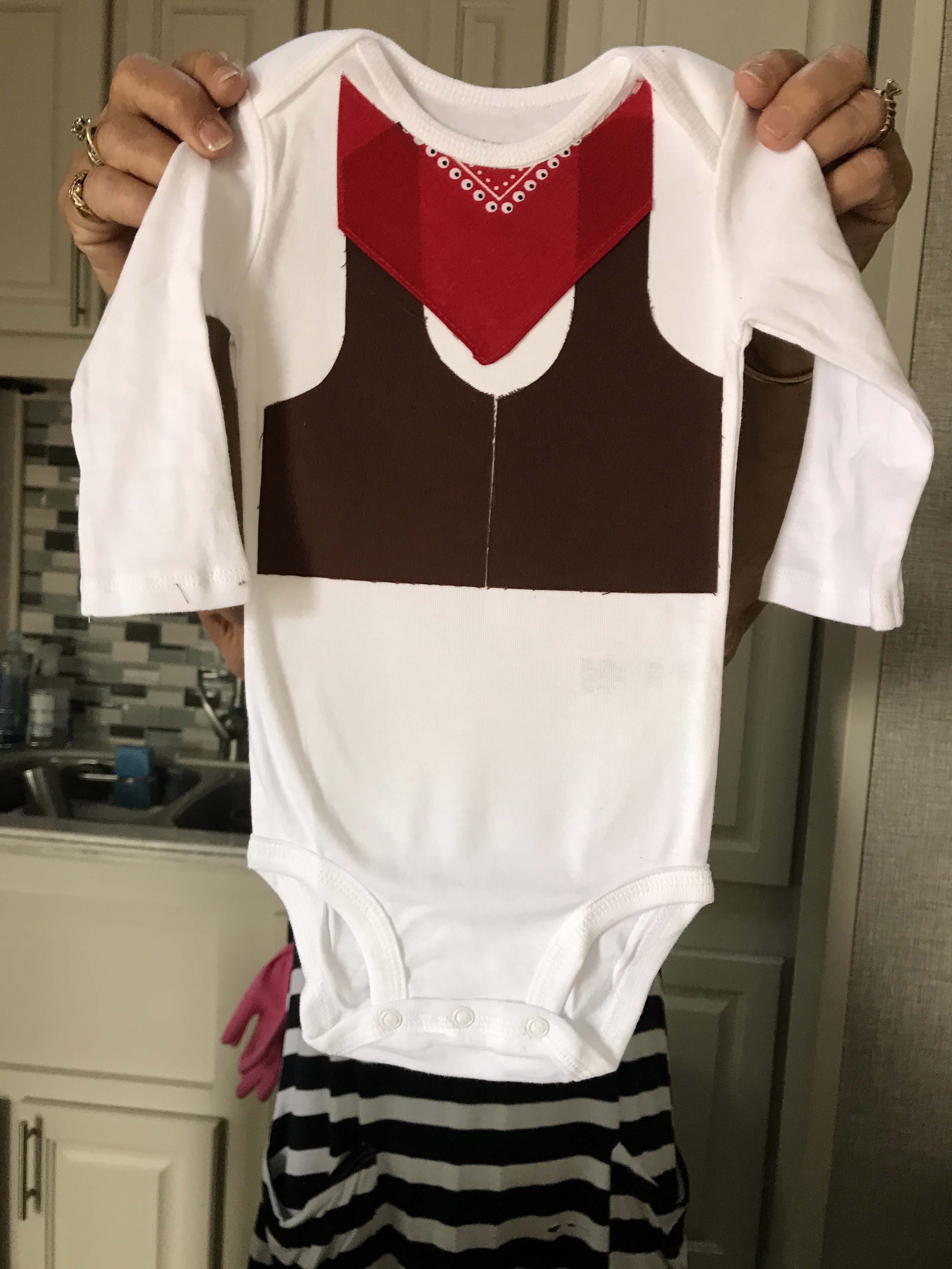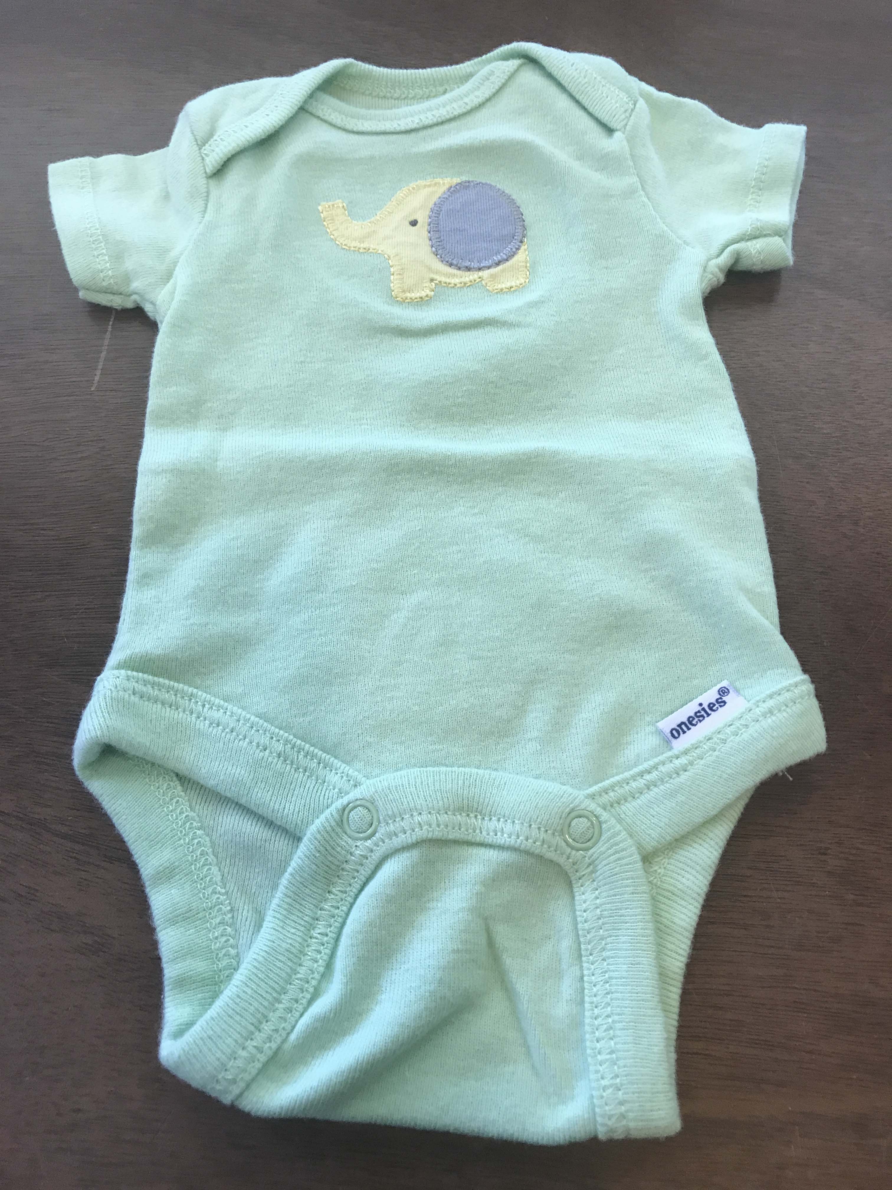 Next I wanted to try to use Hodge Podge, which is a fabric glue. I had read that I could take material and cut out parts of it and glue them onto onesies. I had never done this before, but found some fabric at Hobby Lobby I liked. I learned I could get as much or as little as I wanted so my piece of fabric only cost $2.50. Then I cut out the parts I wanted and glued them on a used onesie. The Hodge Podge worked very well, but it was messy. Not sure how these will hold up after washing, but it is very solid now.