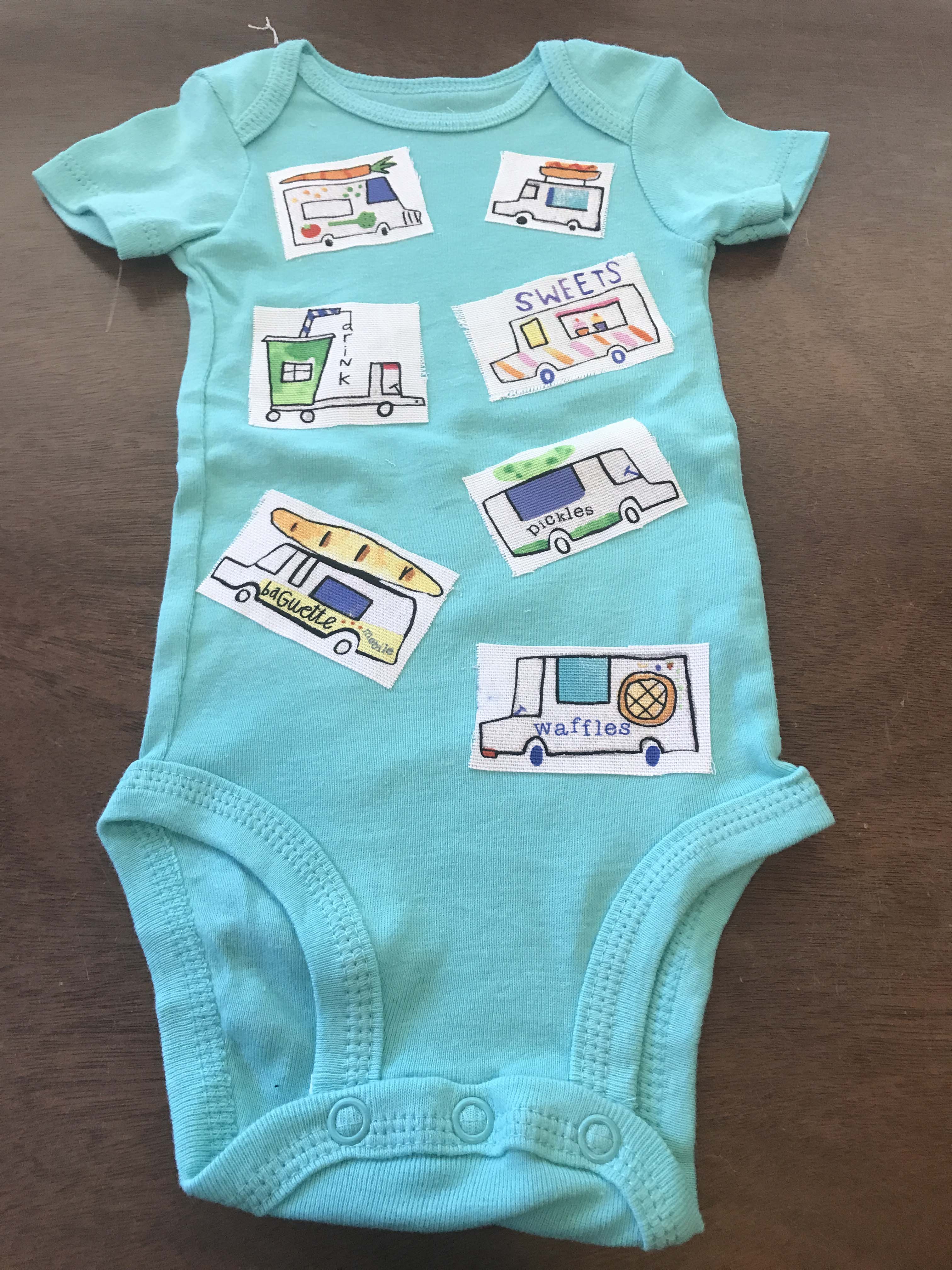 Since Sue had lots of equipment, I brought my supplies to her place and we laid the onesies out and paired them with the designs I wanted to do. Then we started with the simplest techniques, the first of which was iron on patches. I had looked for on sale or clearance patches in every store and ended up finding some really cute ones, all under $3.