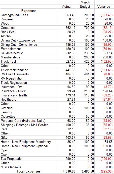 Sorry this has taken me so long to get completed, but as you all know there has been a ton going on.  Because of Lee’s heart attack we only made about $1100 in the month of March, but thankfully we got a $1700 Income Tax return that really helped. Lee also made $2800 for working in March but we still haven’t gotten paid for that. We had also socked some money away in January and February so we think we are going to squeak by without tapping our savings.  Still not 100% sure on that, it depends on when the summer job checks start rolling in.  We ended up spending $4311 in March which was $825 over budget.  These costs do NOT include any medical expenses.  Those bills are still coming in and I will report out on them separately. Please see below for more detailed information.