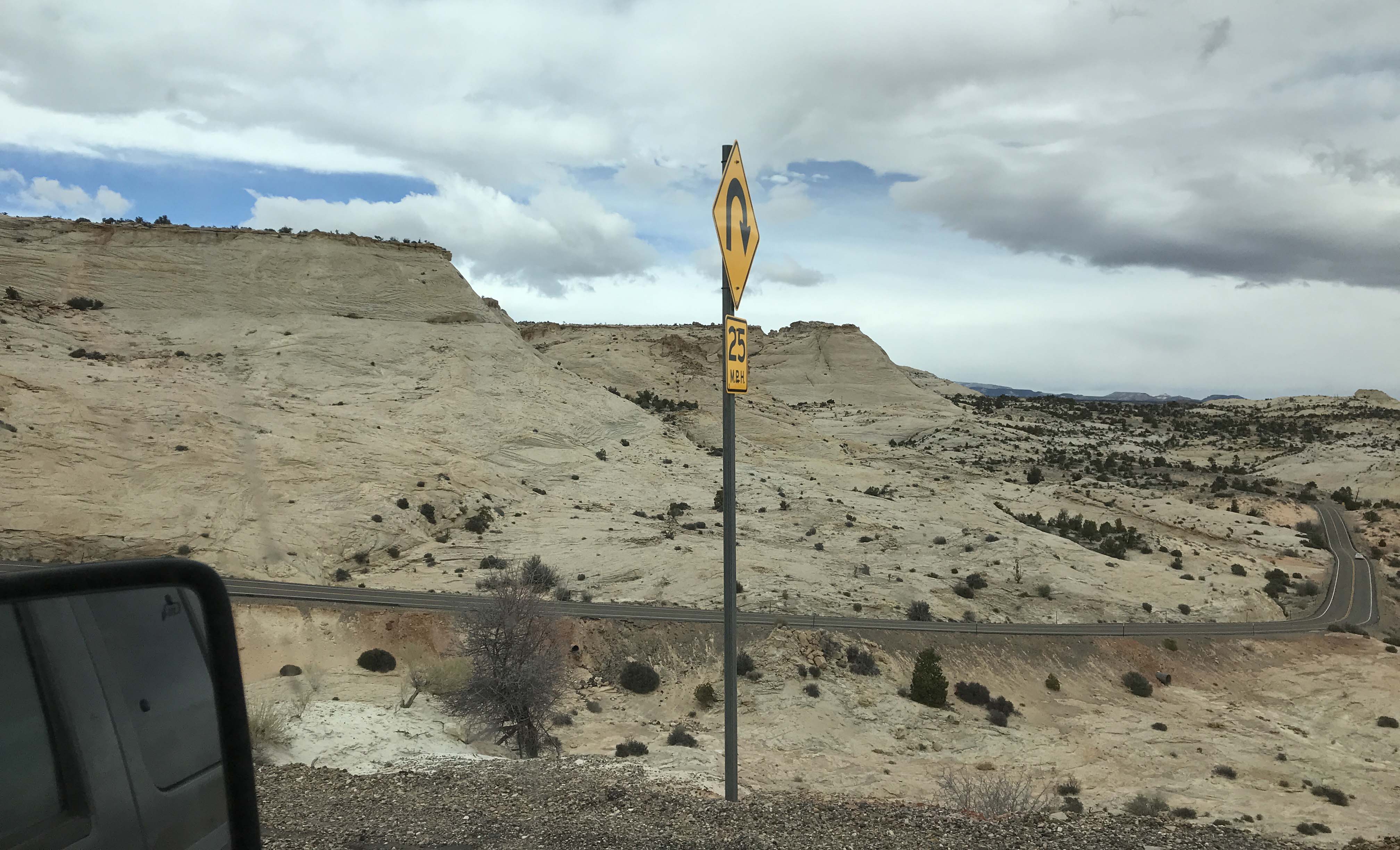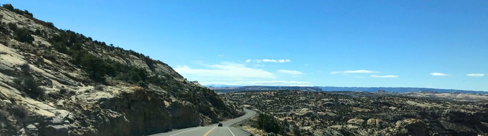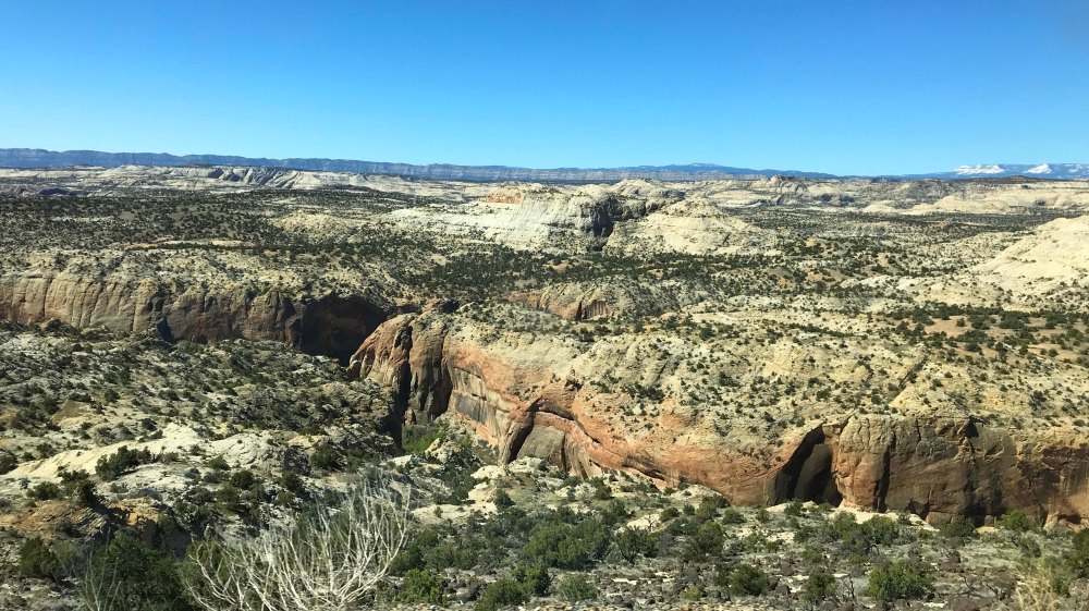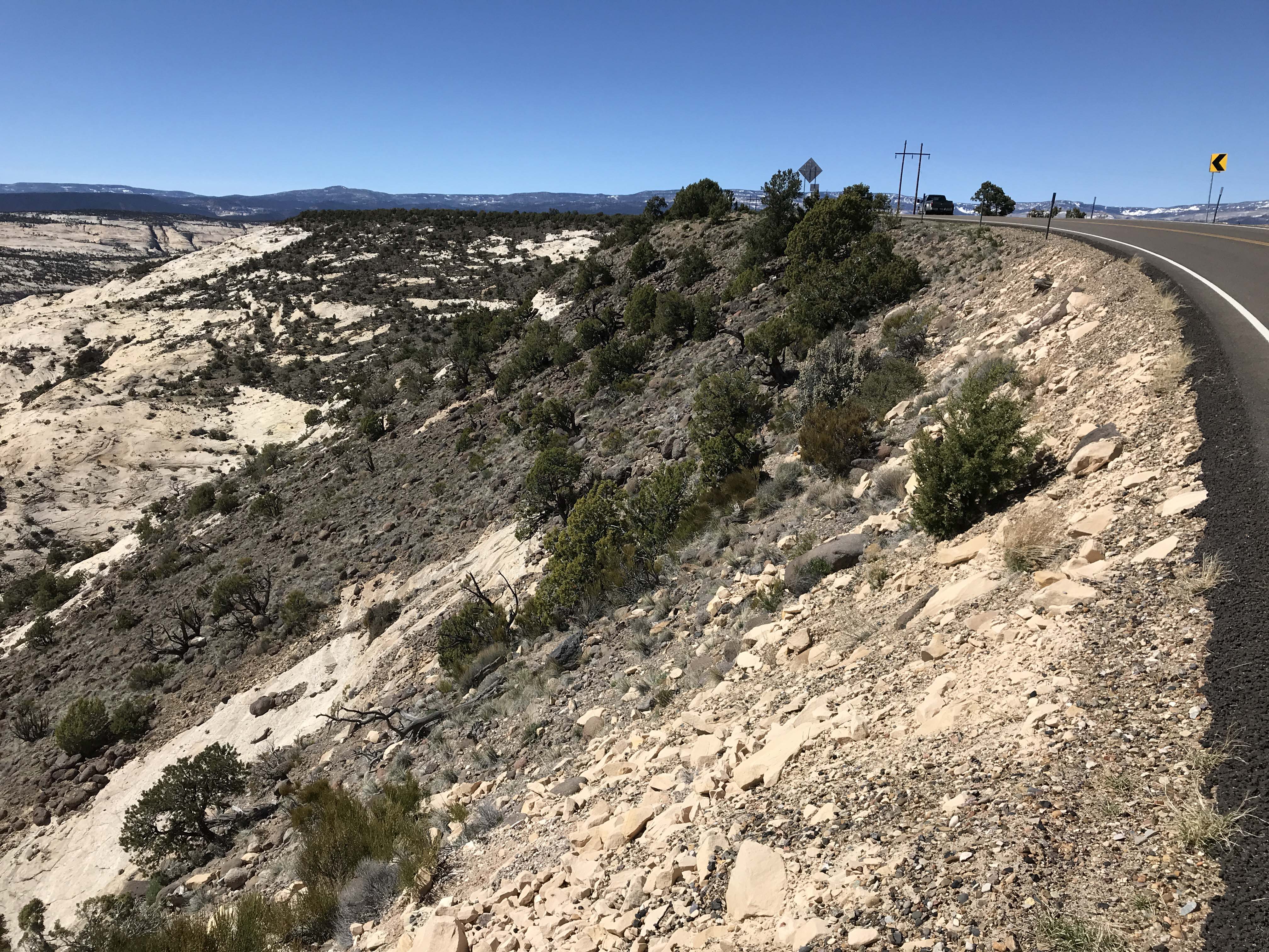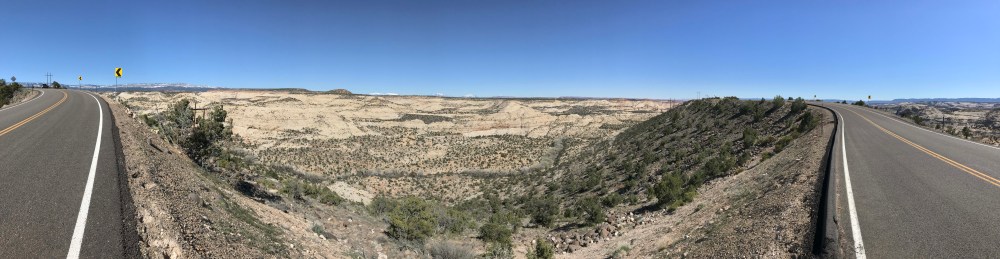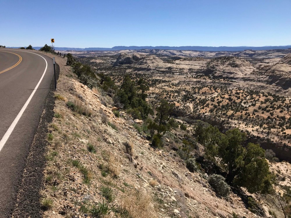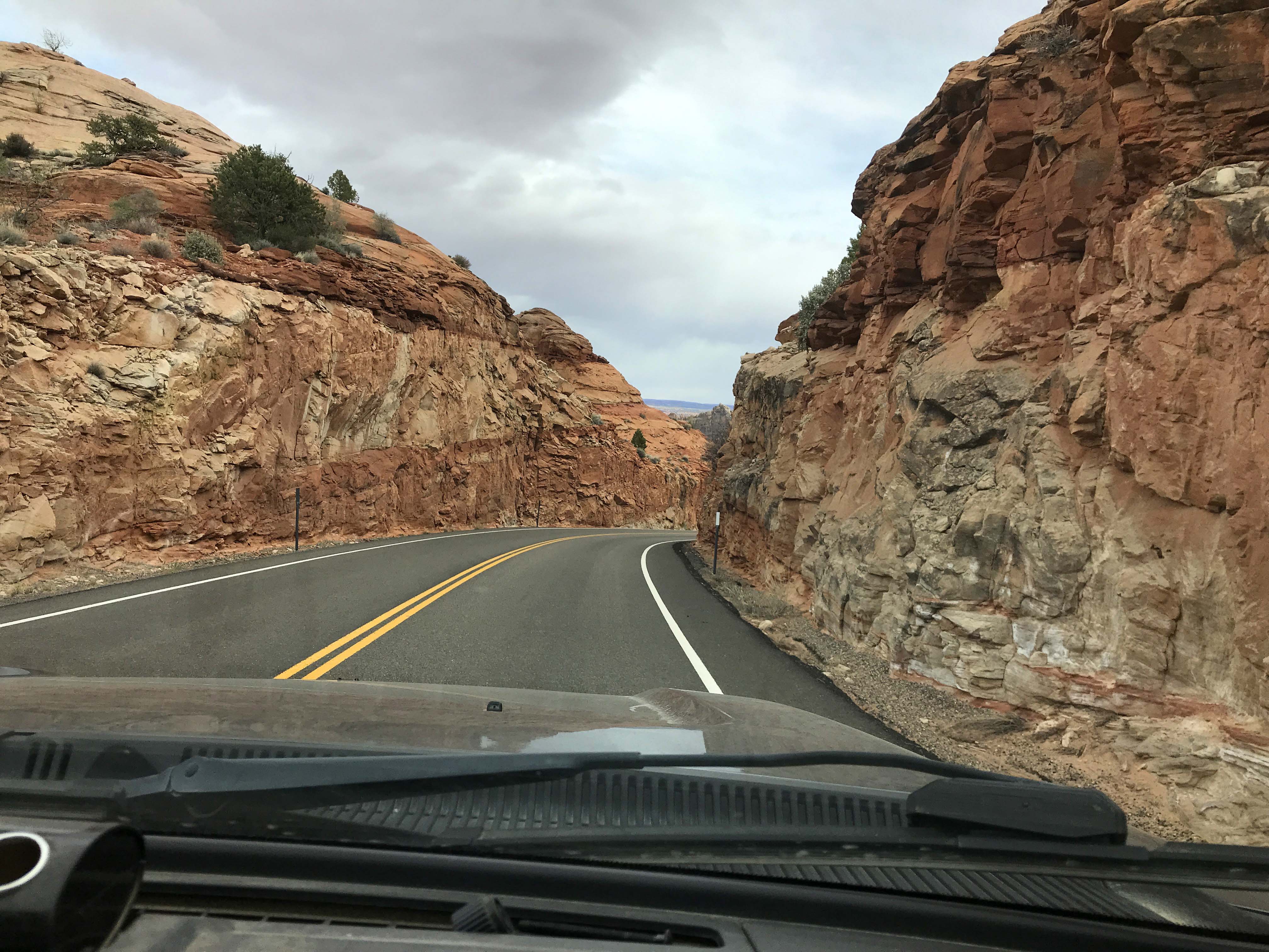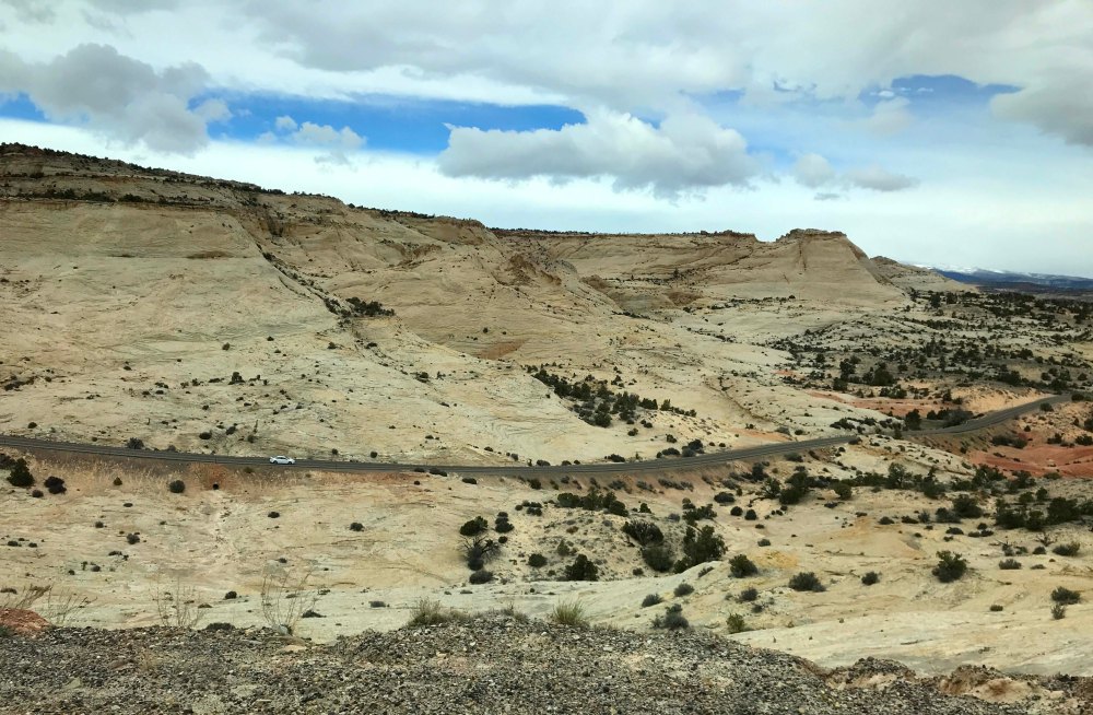 Now that we got that out of the way, let me tell you about how amazing the road is. First of all, it starts at both ends at higher elevations, with pine trees and snow, and then drops down into the Grand Staircase Escalante, which has desert terrain. The contrast is stunning, and we learned later from the Escalante Visitors center that the route passes through six elevation zones.
