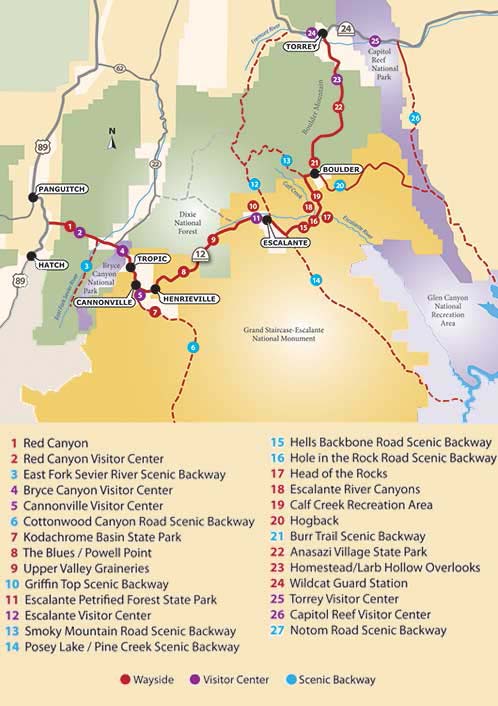 No matter which way you travel the road, I highly recommend a stop at the Visitors center. They can give you the most up to date information on what is happening, in particular the state of the roads. As you can see from the map at the beginning of the post there are lots of scenic byways off of 12. Before traveling on any of them though, I absolutely recommend talking to a ranger, because you don’t know what the condition of the road may be. We learned for example that all roads north of 12 were closed due to snow. That wasn’t readily apparent from the road and we might have found ourselves stuck because many of the scenic roads can be very narrow with no room to turn around for miles.