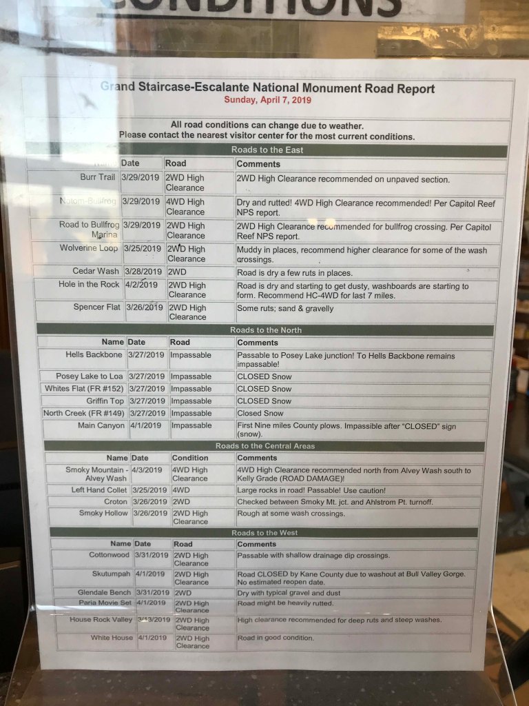 This report is extremely important if you are planning on going off the main road. There is a similar report and visitors center on the southern portion of Grand Staircase as well. Because we have 4WD we have to be especially cautious, but even 4WD can get stuck in snow and mud.