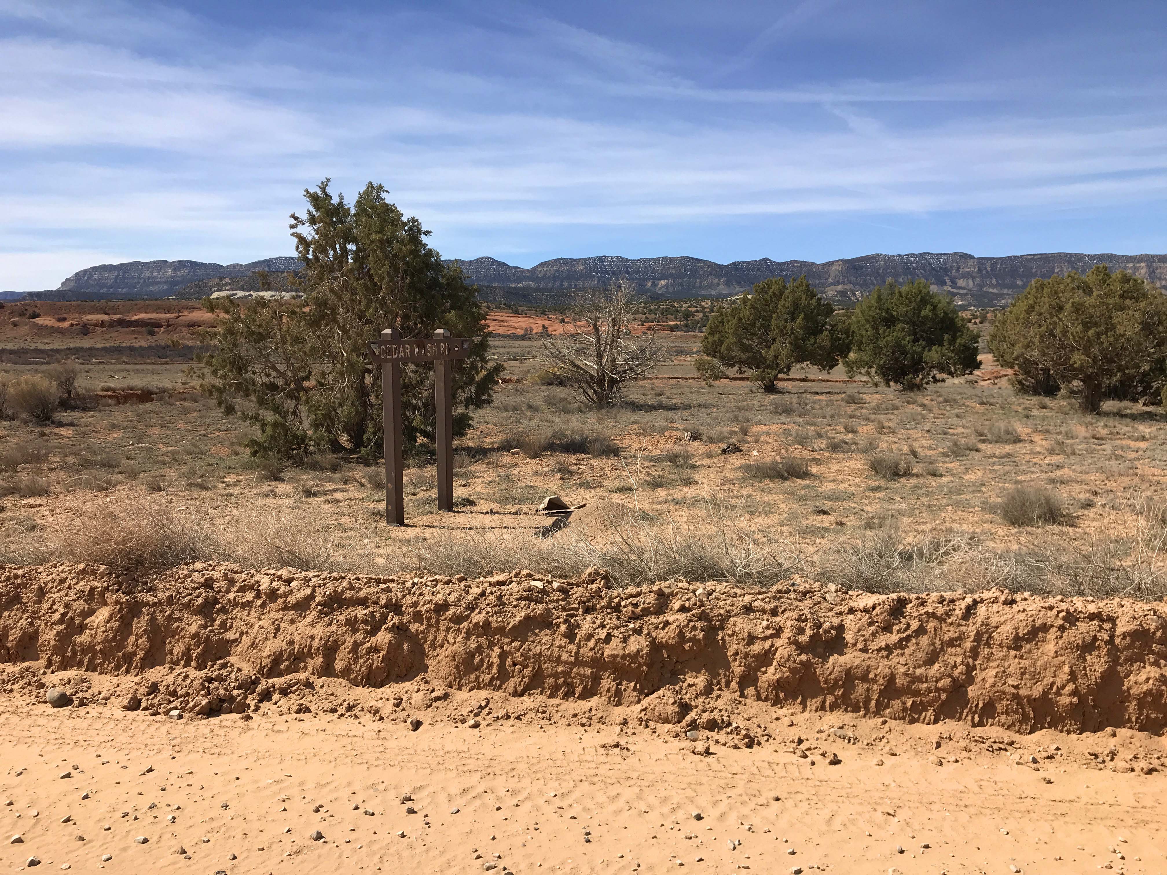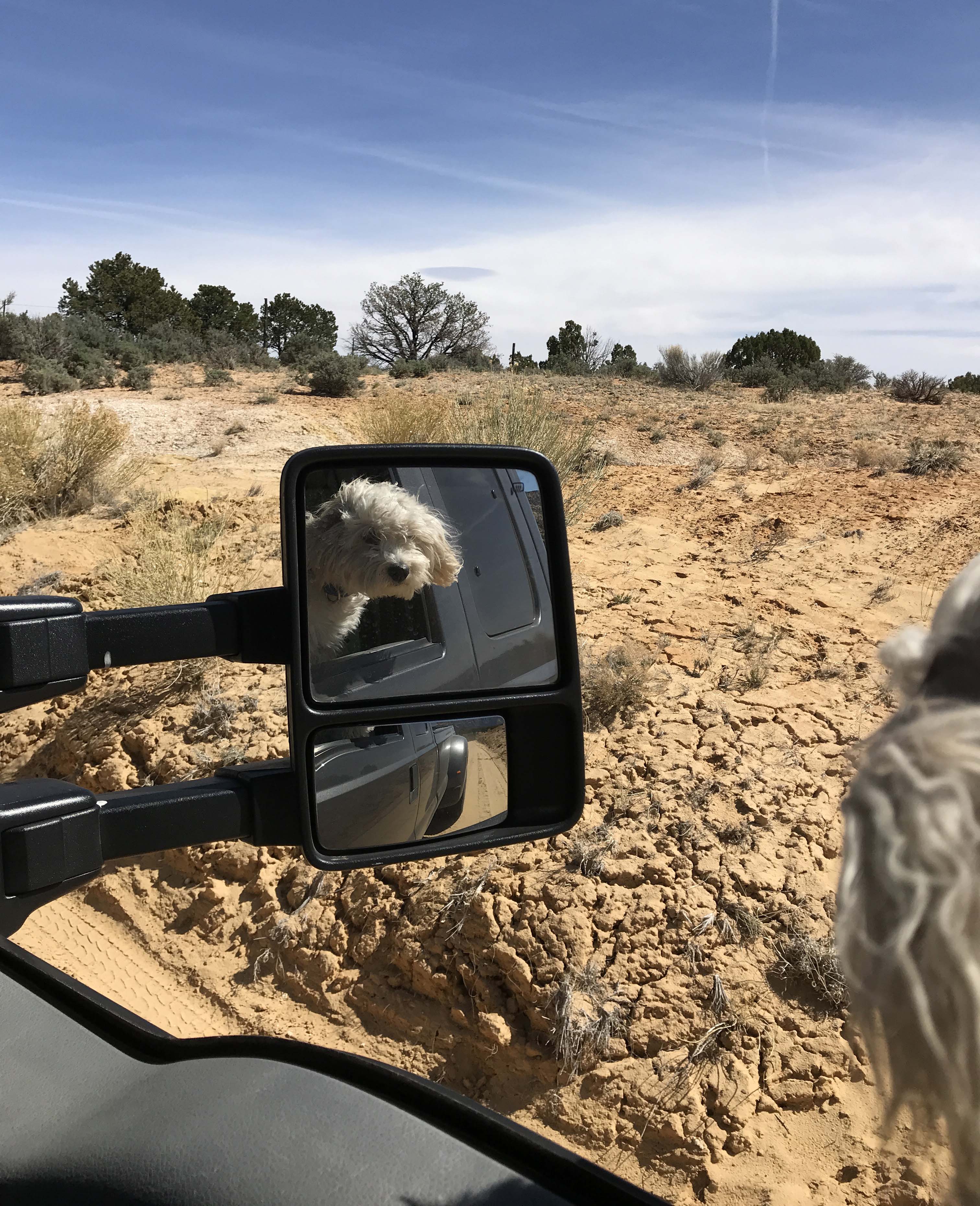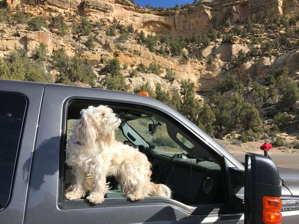 Based on the road report and talking to the ranger, we did decide to try a short drive on nearby Cedar Wash road. At a much lower elevation it was clear and dry. It’s a good thing we did talk to them because the signs really aren’t that great. We started out going down Hole-in-The-Rock road and eventually hit Cedar Wash which circles around to Main Street. It was fun getting off road a bit and because we were going so slow I could let Jack hang out the window which he liked.