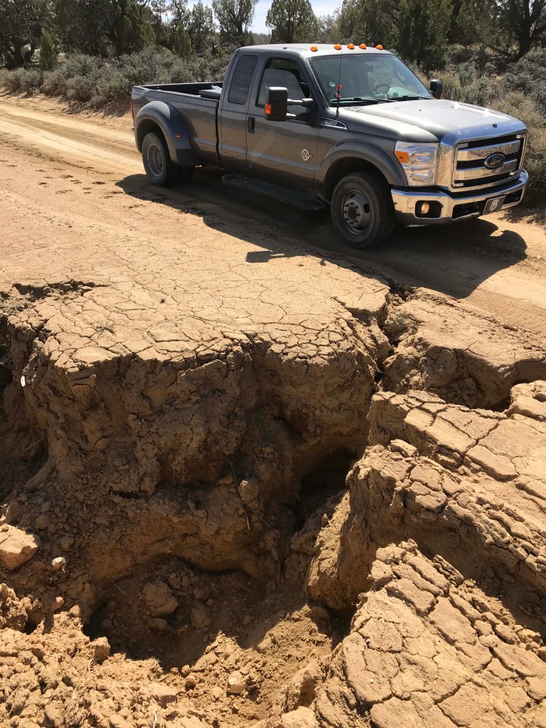Here is an example of why you shouldn’t travel these roads without checking first. This washout had been recently repaired, otherwise we would have been backing out.