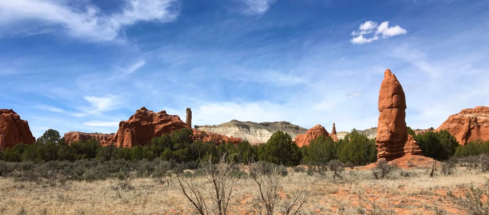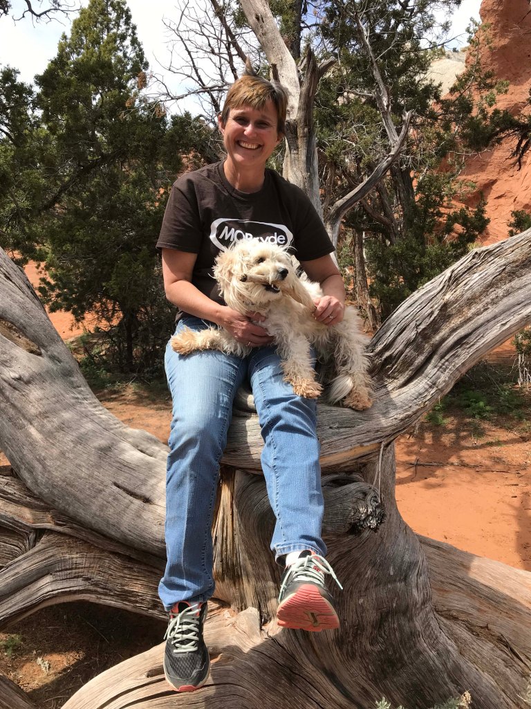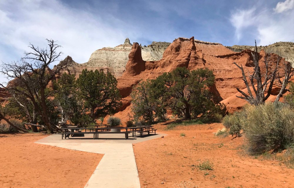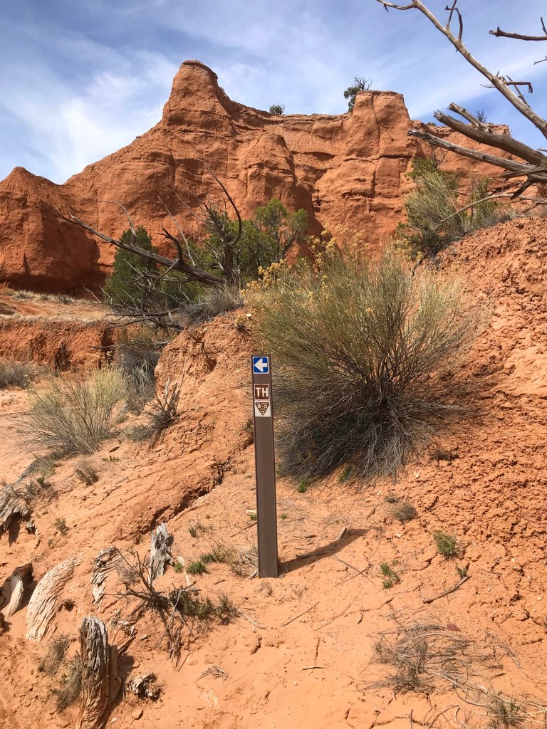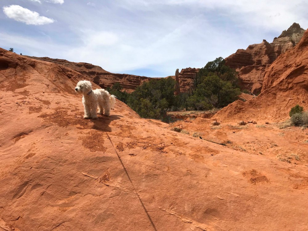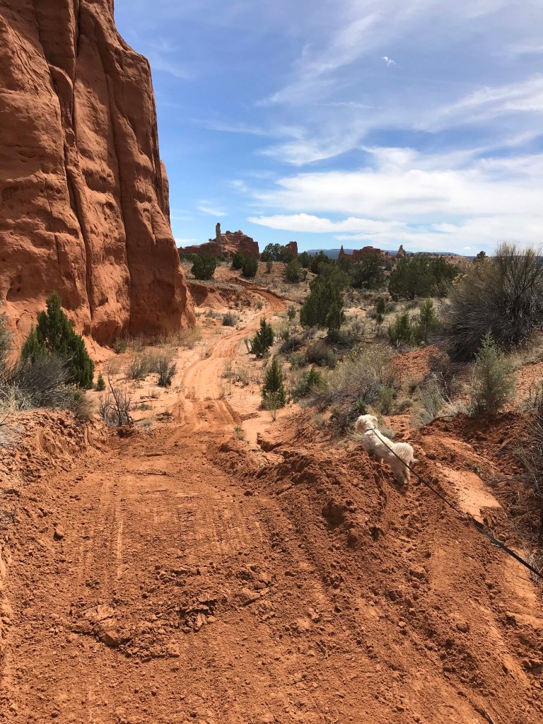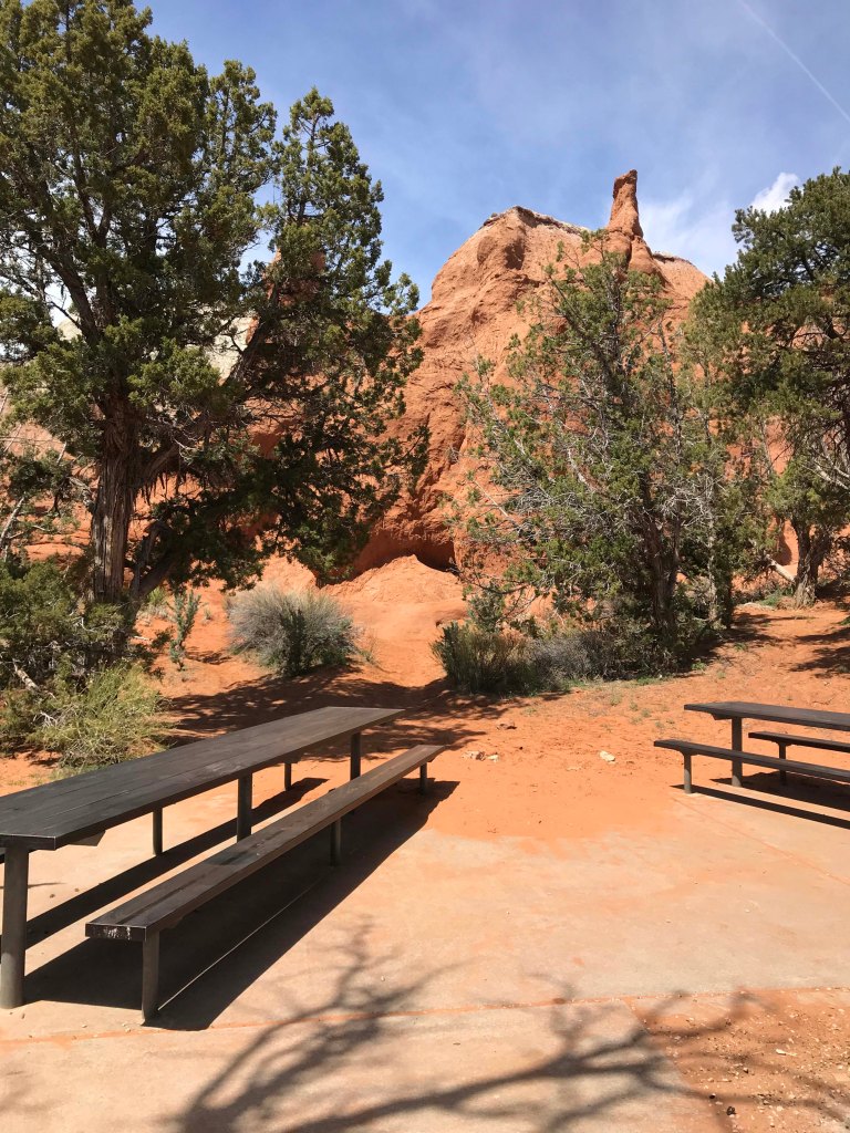 While we were driving Route 12, we decided to take a 9 mile detour and visit Kodachrome Basin State Park. Last year when we drove Cottonwood Canyon Road we ended up here, but didn’t want to pay the $8 day use fee because it was so late in the day. We had heard that there were lots of hiking trails in the park and of course it was known for the ability to camp within the rocks. It also seemed like a really good place to take Jack on his first hike. I had been putting this off, because I was a little nervous about how well he would do. He has the boundless energy of a puppy, but also the lack of self control, and walking him is often a challenge because he is all over the place. I wasn’t sure how that would look on a hiking trail, and really wanted Lee to be with me when we gave it a try. Usually we would go inside and watch the movie, but it was 17 minutes long and I didn’t want to leave Jack in the truck that long. I thought it would be too hot. Instead we asked where the best place to have lunch was, and grabbed a brochure so that we could select a hike.