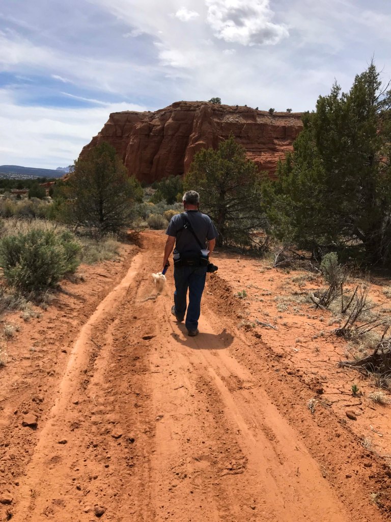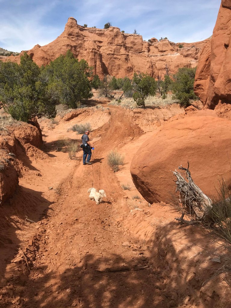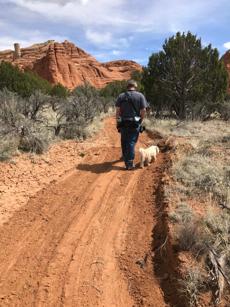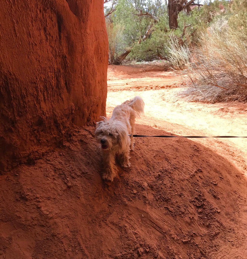 By the time lunch was over it was starting to get a little hot, so I decided on a 1.5 mile canyon floor hike. I definitely wanted something flat, plus I enjoy walking at the base of the canyons rather than the steep climbs to overlooks along the rim. I much prefer being “within the rocks” and all things being equal I’ll take a flat hike over one with elevation any day. We made sure we had plenty of water and were delighted to see that Jack’s water bottle fit perfectly in our Outdoor Mojave waist hiking packs. On really long trips we use our hydration packs but most hikes we are fine with the waist packs and I really prefer them. After trying numerous packs since becoming fulltimers, these are the first packs that don’t hurt my back.