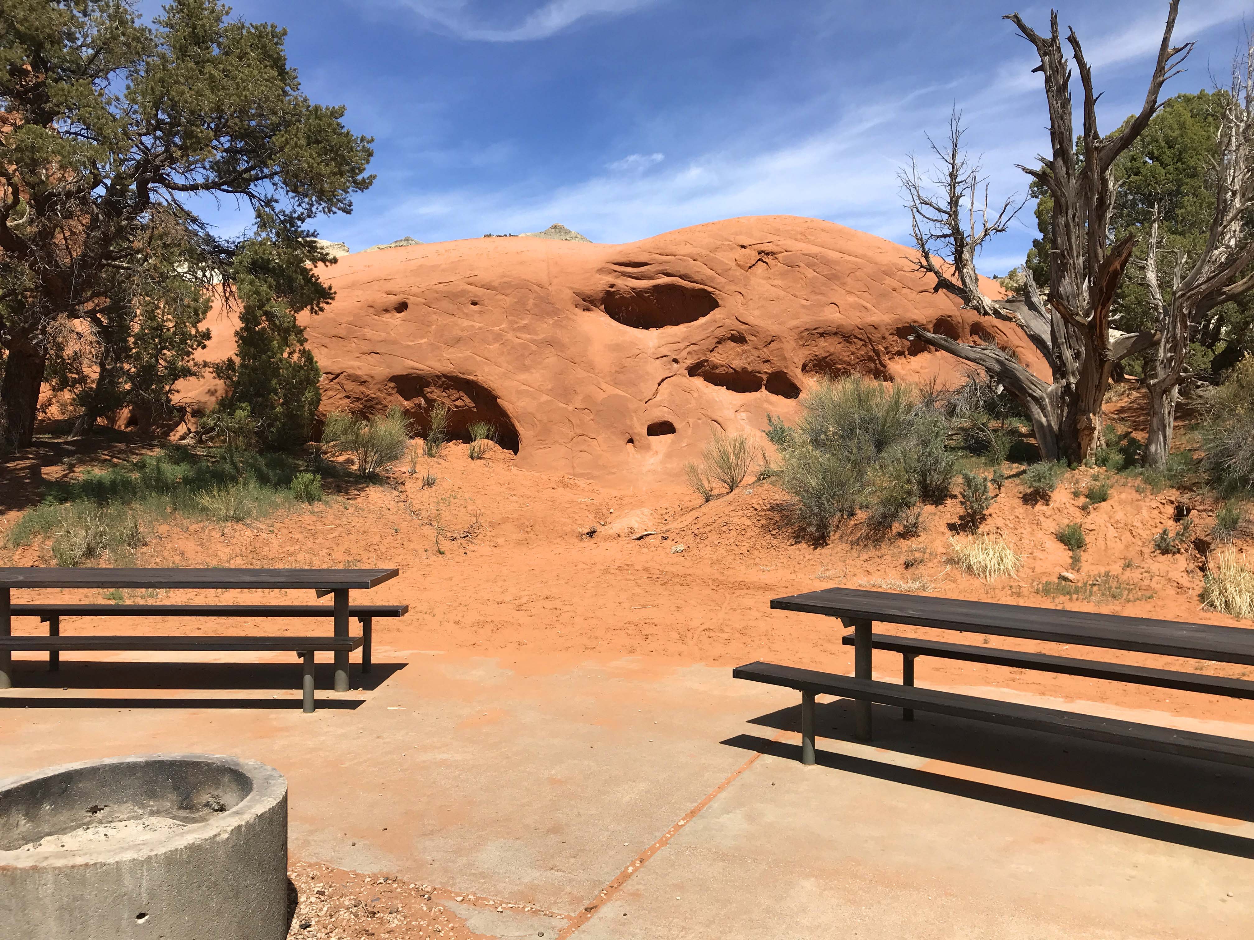 While we were driving Route 12, we decided to take a 9 mile detour and visit Kodachrome Basin State Park. Last year when we drove Cottonwood Canyon Road we ended up here, but didn’t want to pay the $8 day use fee because it was so late in the day. We had heard that there were lots of hiking trails in the park and of course it was known for the ability to camp within the rocks. It also seemed like a really good place to take Jack on his first hike. I had been putting this off, because I was a little nervous about how well he would do. He has the boundless energy of a puppy, but also the lack of self control, and walking him is often a challenge because he is all over the place. I wasn’t sure how that would look on a hiking trail, and really wanted Lee to be with me when we gave it a try. Usually we would go inside and watch the movie, but it was 17 minutes long and I didn’t want to leave Jack in the truck that long. I thought it would be too hot. Instead we asked where the best place to have lunch was, and grabbed a brochure so that we could select a hike.