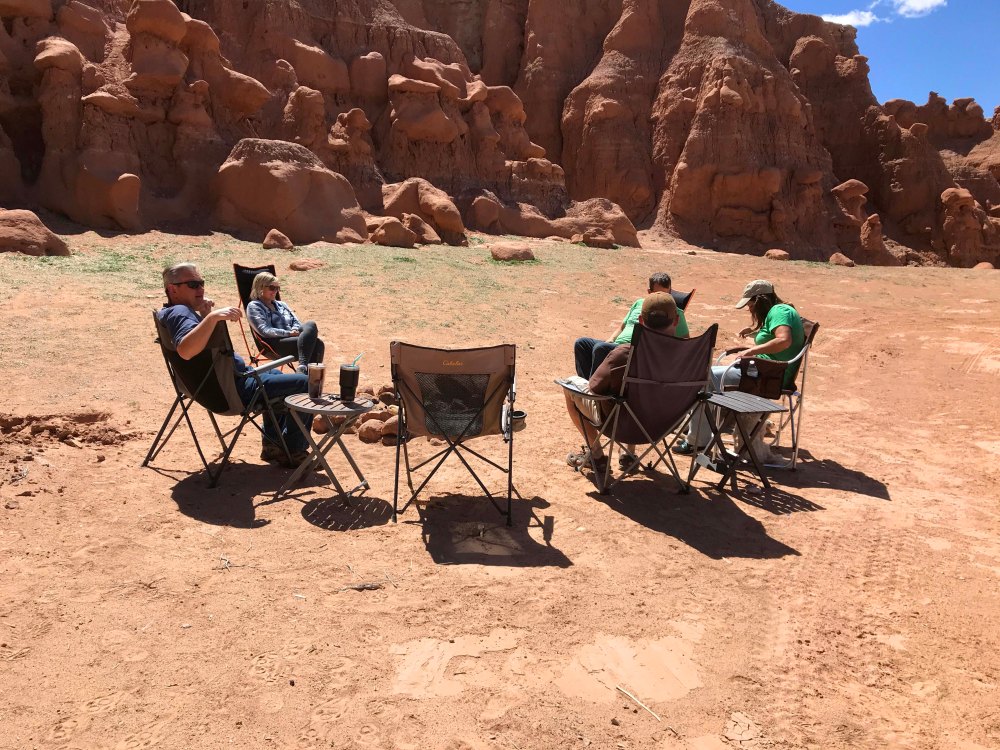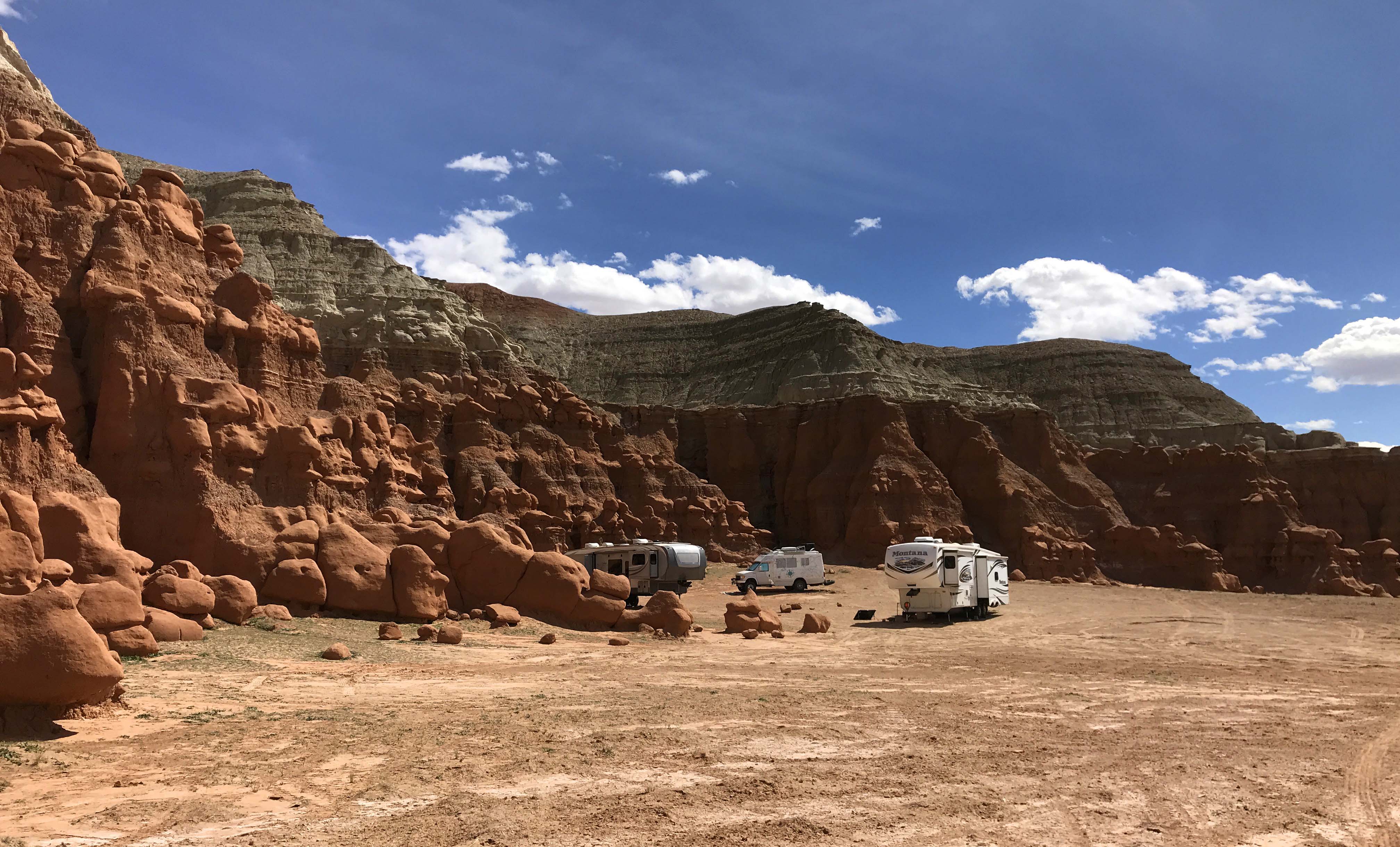 First we had to find a place and that turned out to be a little more challenging than expected. Yes, there are tons and tons of spots in the area, but there were also a surprising number of people boondocking. We also needed a spot that was big enough for three rigs, and relatively flat, which was a little more challenging. Ultimately we just started driving down the road out of Goblin Valley and turned left at the first dirt route after the sign that tells you you have left the state park. Once we were on that road we kept going until we found a spot that would work for us. In retrospect after exploring the area, I would actually recommend going father on the paved road rather than turning off on the first dirt road. But that’s personal preference, it’s pretty wide open and there are lots of places to go.