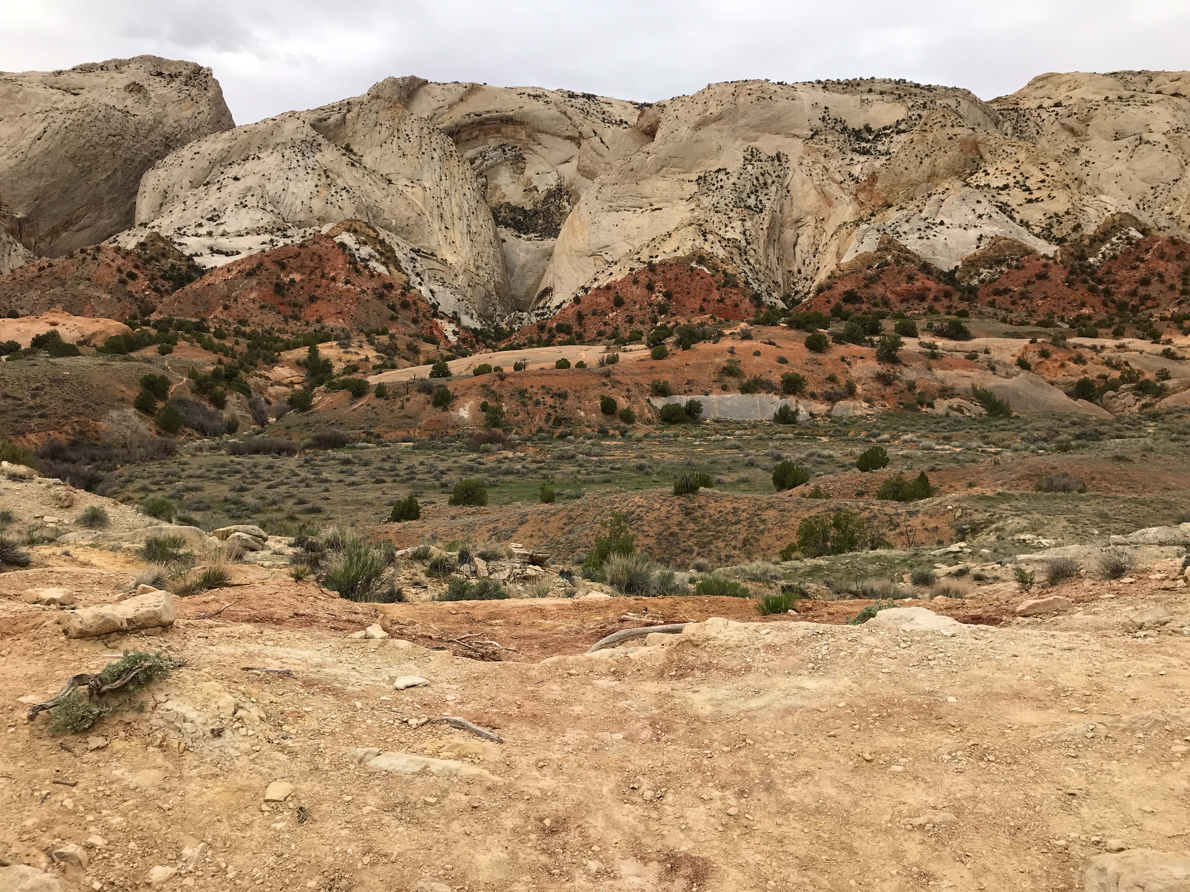 We could have stayed much longer near Goblin Valley, but not having internet for more than four days was a challenge for all of us.  After taking a look at the weather, we decided to head back to the boondocking spot in Torrey in the hopes that it would be clear. We knew it would be windier and colder there, but it was also the perfect jumping off point to explore Capitol Reef and Route 12.  We had a long list of things we wanted to do in the area, and were looking forward to being able to explore with Deb and Steve.  Thankfully the spots were open ,and we were able to all fit in, but unfortunately it was cold and overcast.  Since it didn’t look like the weather would improve all day on Tuesday we decided to take one of the scenic drives.   Cori and Greg volunteered to take us all in their Chinook, so we set out for Burr Trail Road which we knew would ultimately lead us to Anasazi State Park in Boulder.