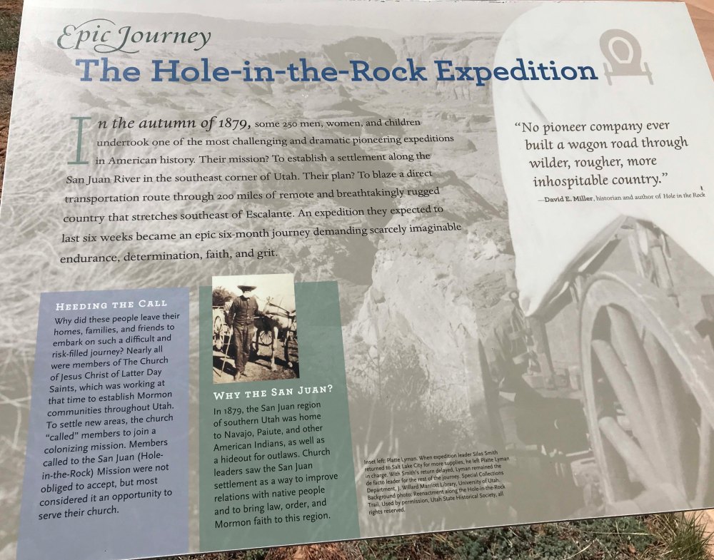 Great information about the Hole in the Rock, thanks. We visited that amazing exhibit near Escalante last year and I agree, the picture of the babies on the blanket with mom handling the wagon is truly badass! It’s an amazing story and you’ve done your usual outstanding storytelling here. Love the pics of you and Lee, you guys look really fantastic. Enjoy the journey!