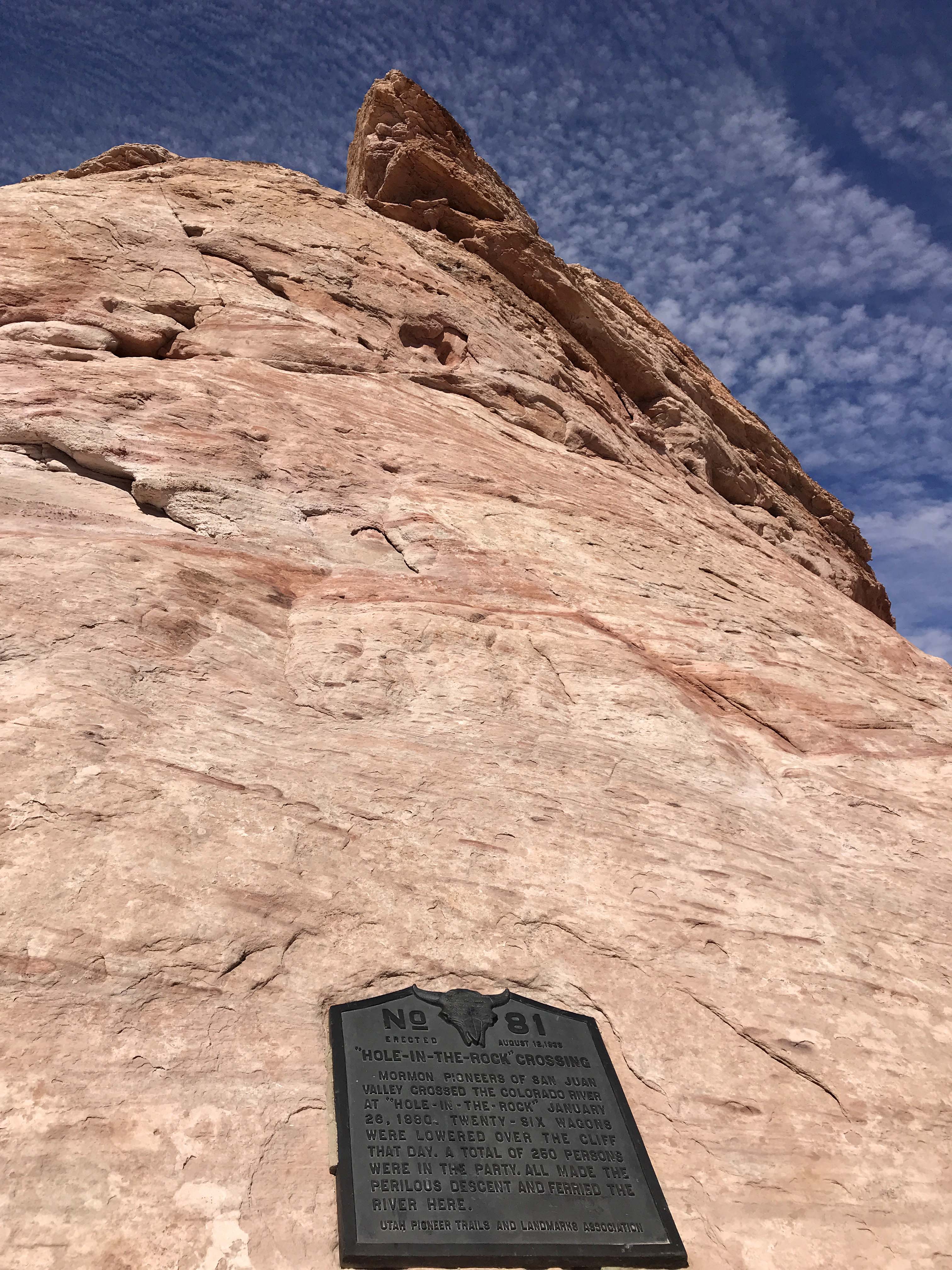 Last year when we were touring Monument Valley, we stopped at the Fort Bluff visitors center and learned about the Hole in the Rock. Essentially, a group of Mormon pioneers were sent to colonize a new area of Utah and because of terrain and hostile natives ended up traveling through an enlarged crevasse in a rock wall. This was a big deal for a couple of reasons. First they had to use dynamite to enlarge the hole and second they had to lower their covered wagons down a steep slope to get through the hole. Still doesn’t sound like that big of a deal? Check this picture out.