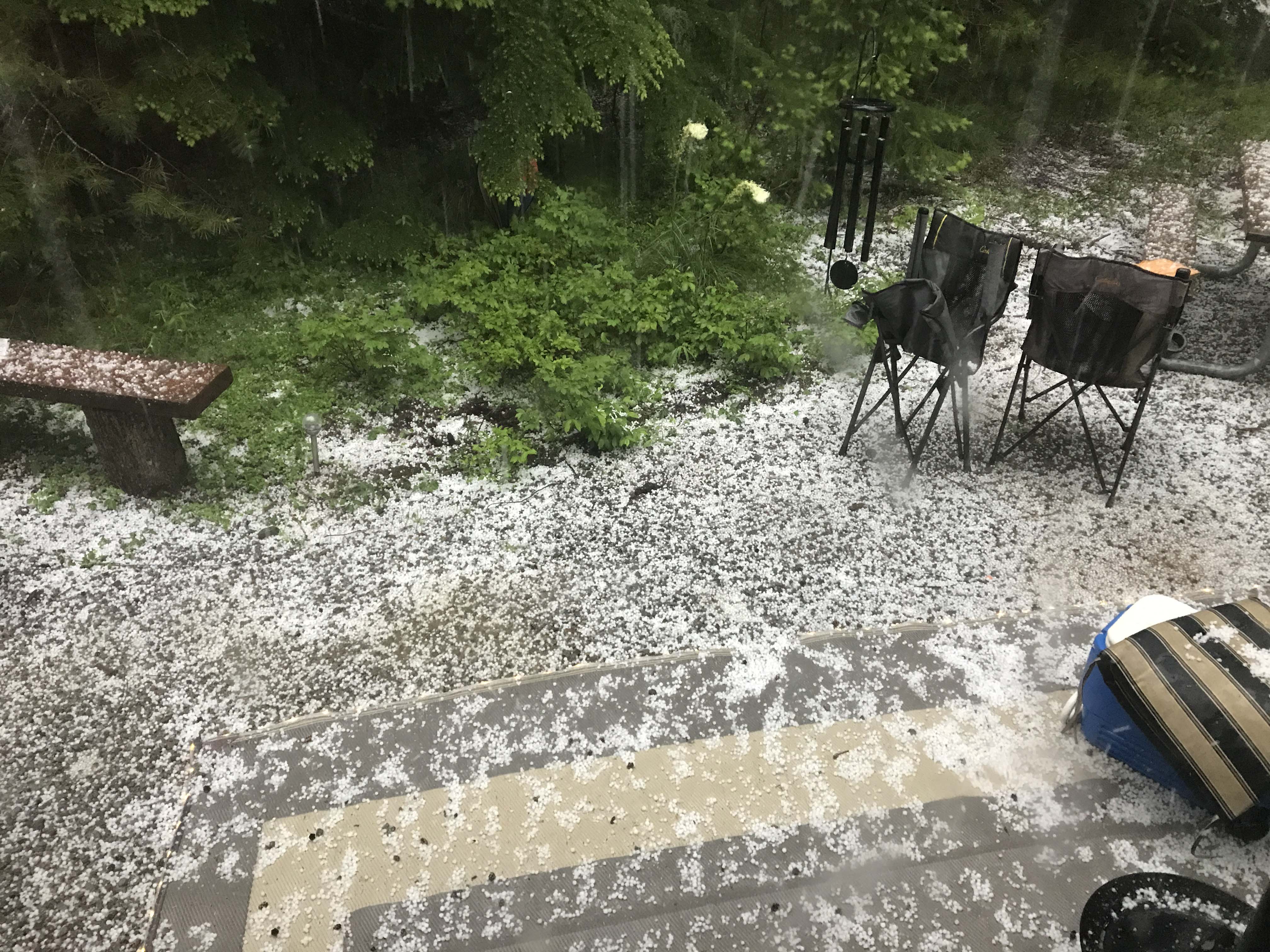All of these errands were fine, but we were really wanting a nice summer day, but unfortunately for three weeks straight the weather was cold and rainy on our days off. It was starting to get us both really down, and then last week something really crazy happened. First we started getting some cracks of lightning and then out of nowhere it started to hail. Thankfully I was in our RV and pulled in the awning, because Lee was in the office and within 10 minutes the ground was coated. Two people who weren’t with their RV’s unfortunately had awning damage. I’ve never experienced anything quite like it. Let me show you.