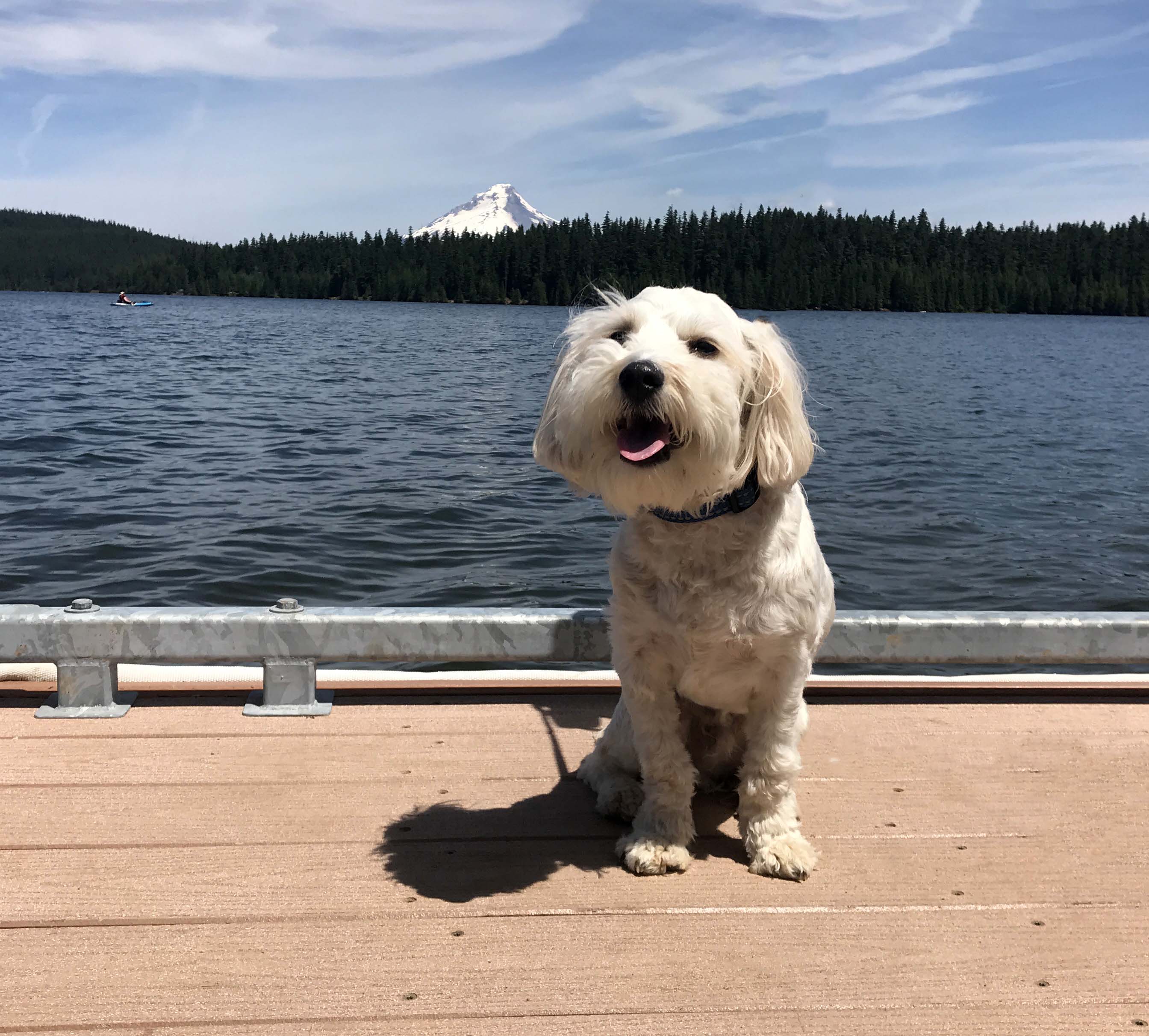 So as you can see the weather hasn’t been that great, but finally on July 4th we had a sunny day. Lee and I went to Bagby Hot Springs, which I will write about in the next post, but before we went we took the time to get some pictures of Jack and Mount Hood. As you can see Jack’s happy about being outside too.