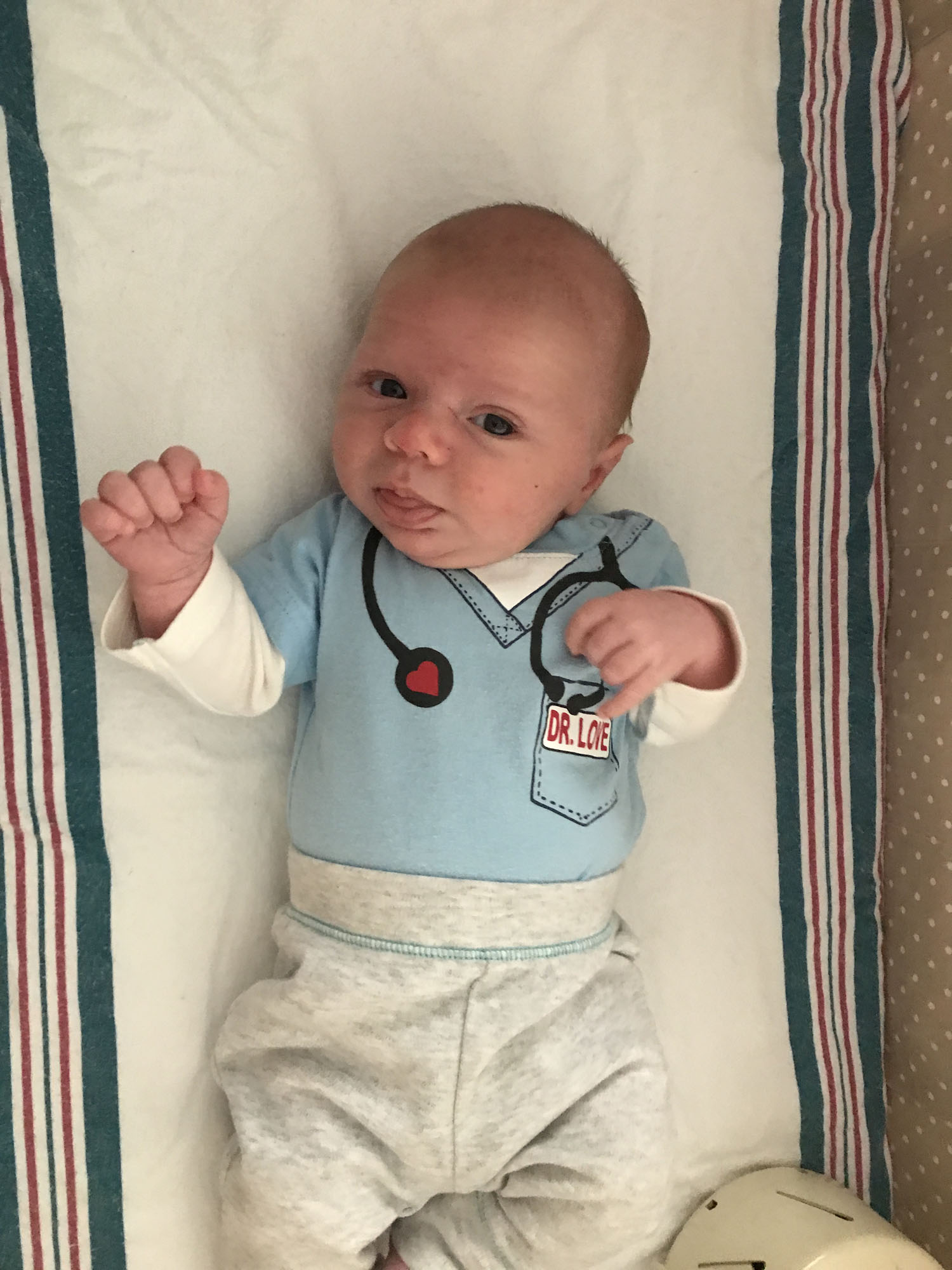 I dressed Oliver in a Doctor Love outfit because I thought Dad would get a kick out of it