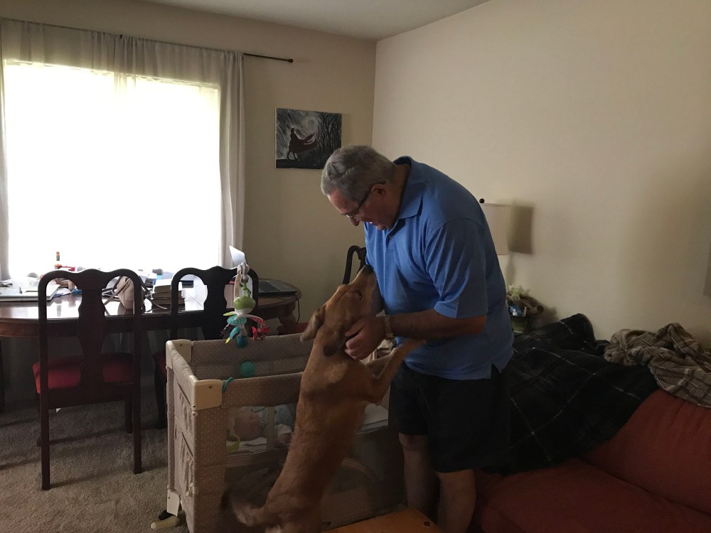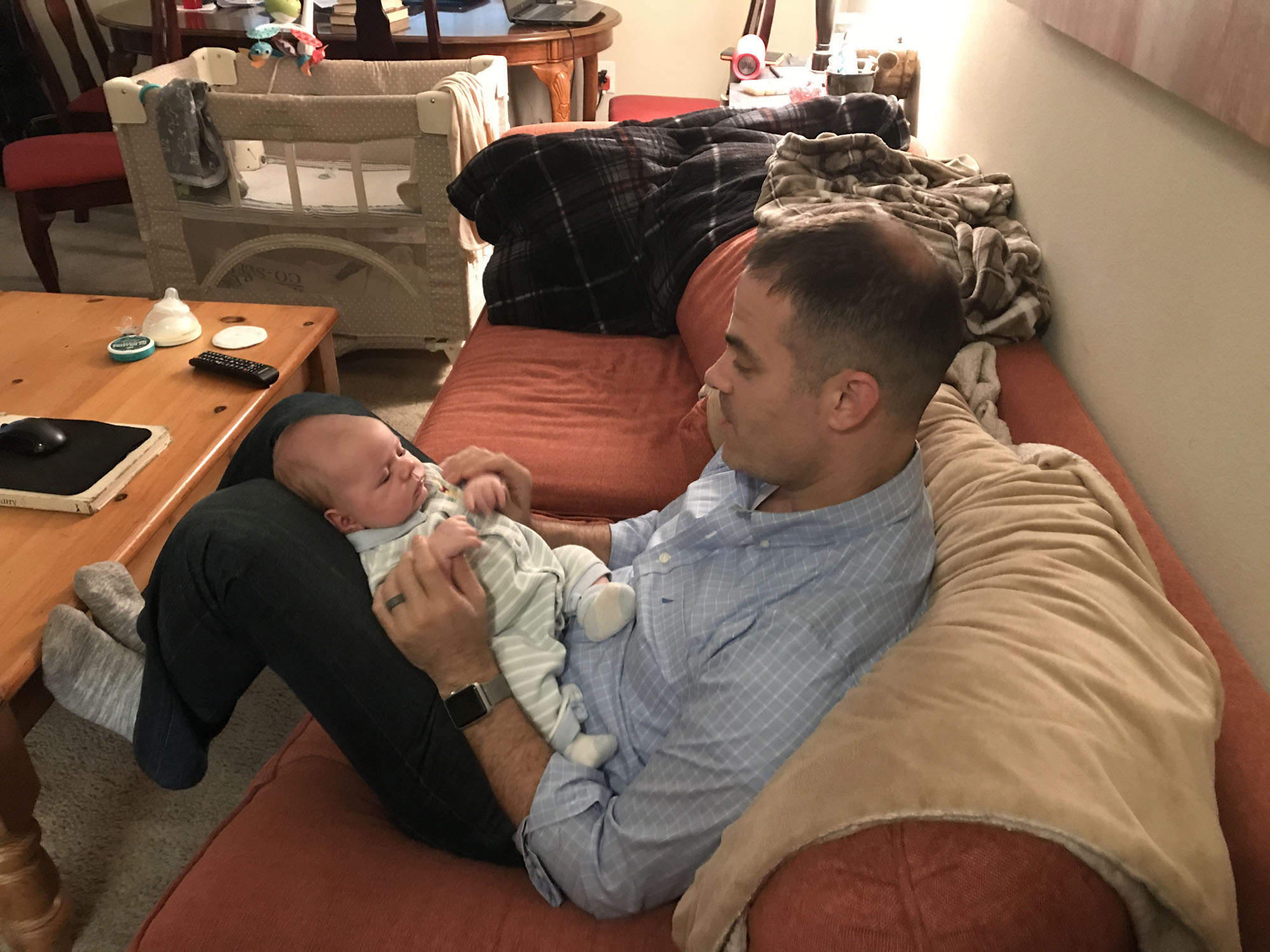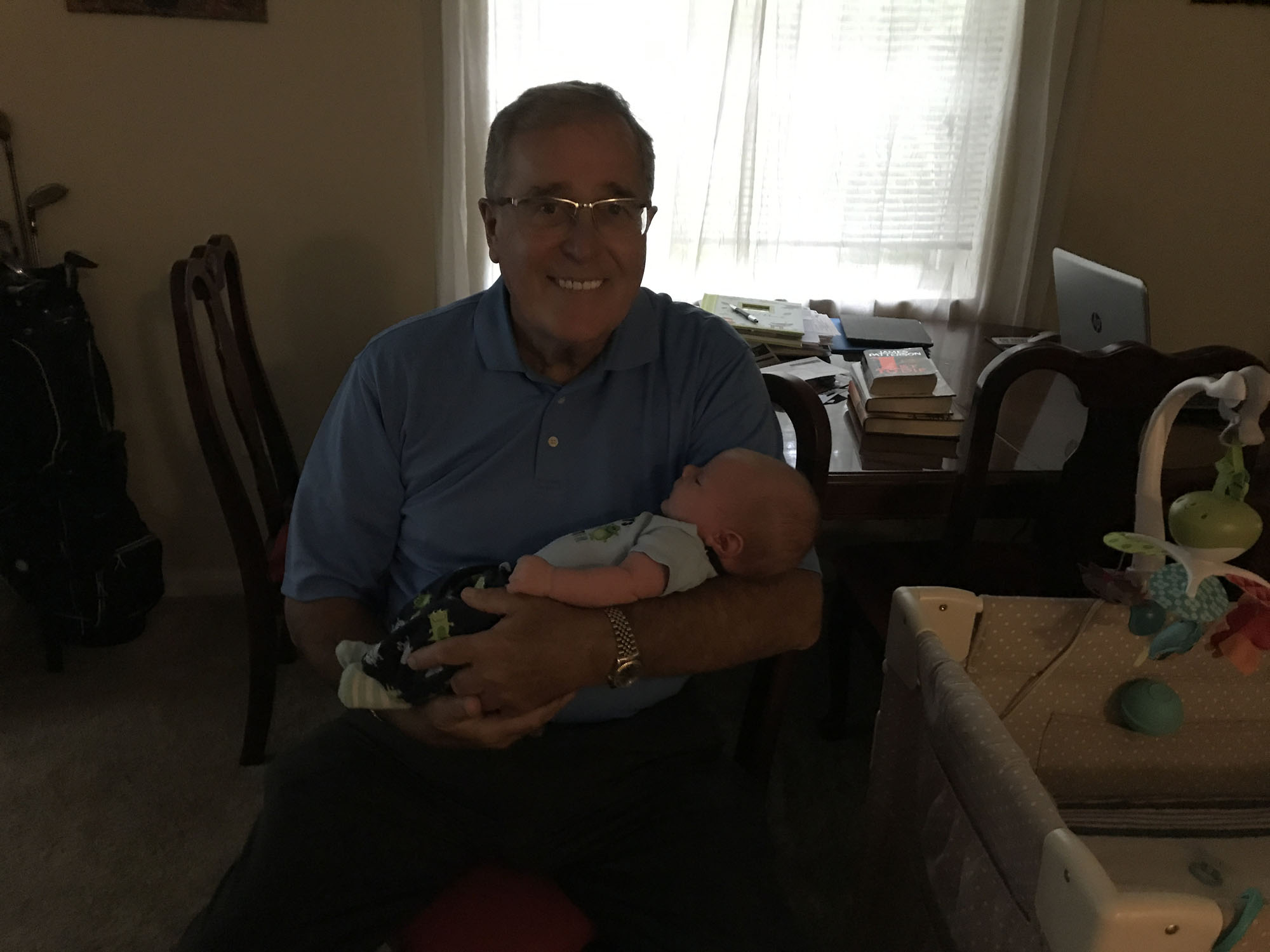 This was my absolute favorite moment. Oliver and Dad were looking intently at each other and then Oliver threw up all over dad. It was priceless!! Dad handled it very well.