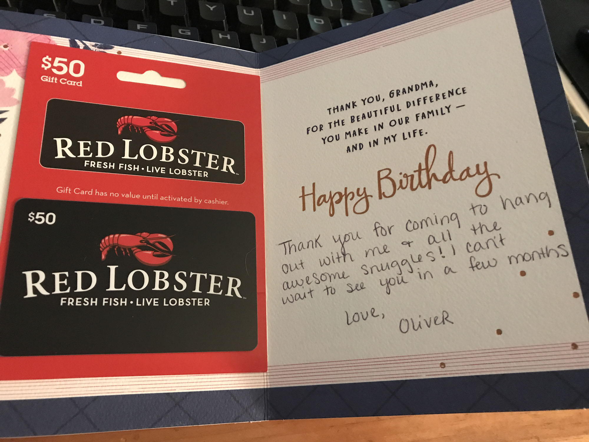 It was a wonderful couple of days and I am so grateful that he took time off work to come down and see us.  I will be flying out on Saturday and as much as I hate to leave I am anxious to get back to Lee and Jack.  We will be coming back in November for Lee to meet his grandson and again I am very grateful that Lee held down the forst so I could do this.  Oh one last thing.  Oliver got me something for my birthday.  It was incredibly thoughtful and the note in the card was my favorite part.  Being a grandmother is really special.