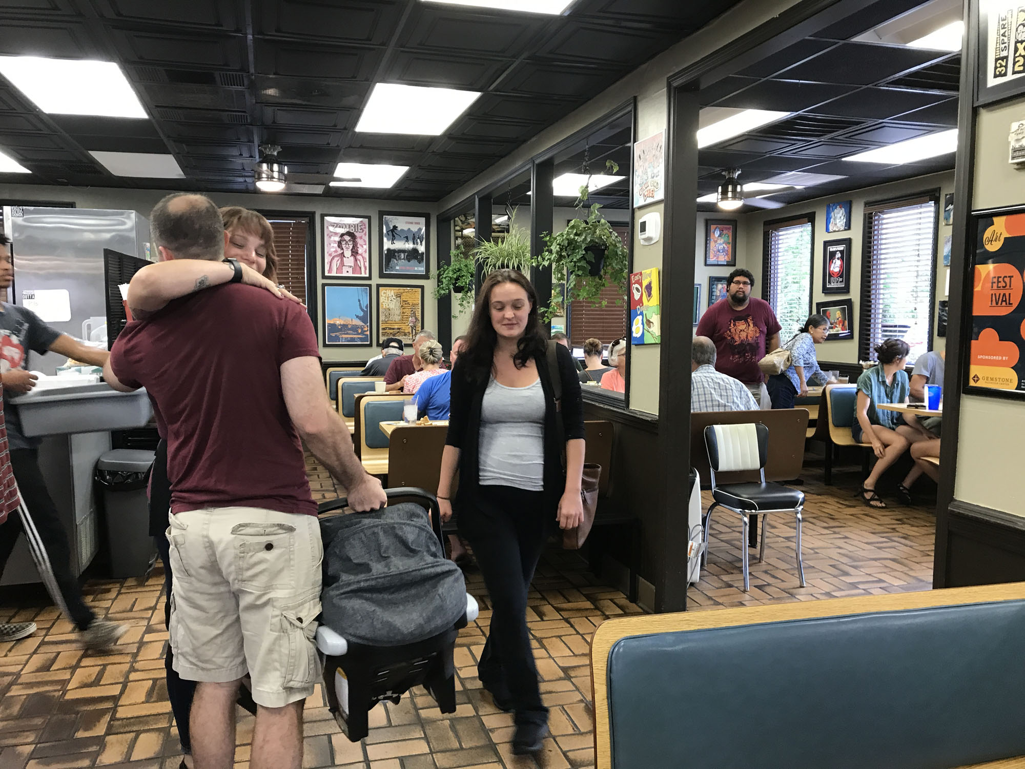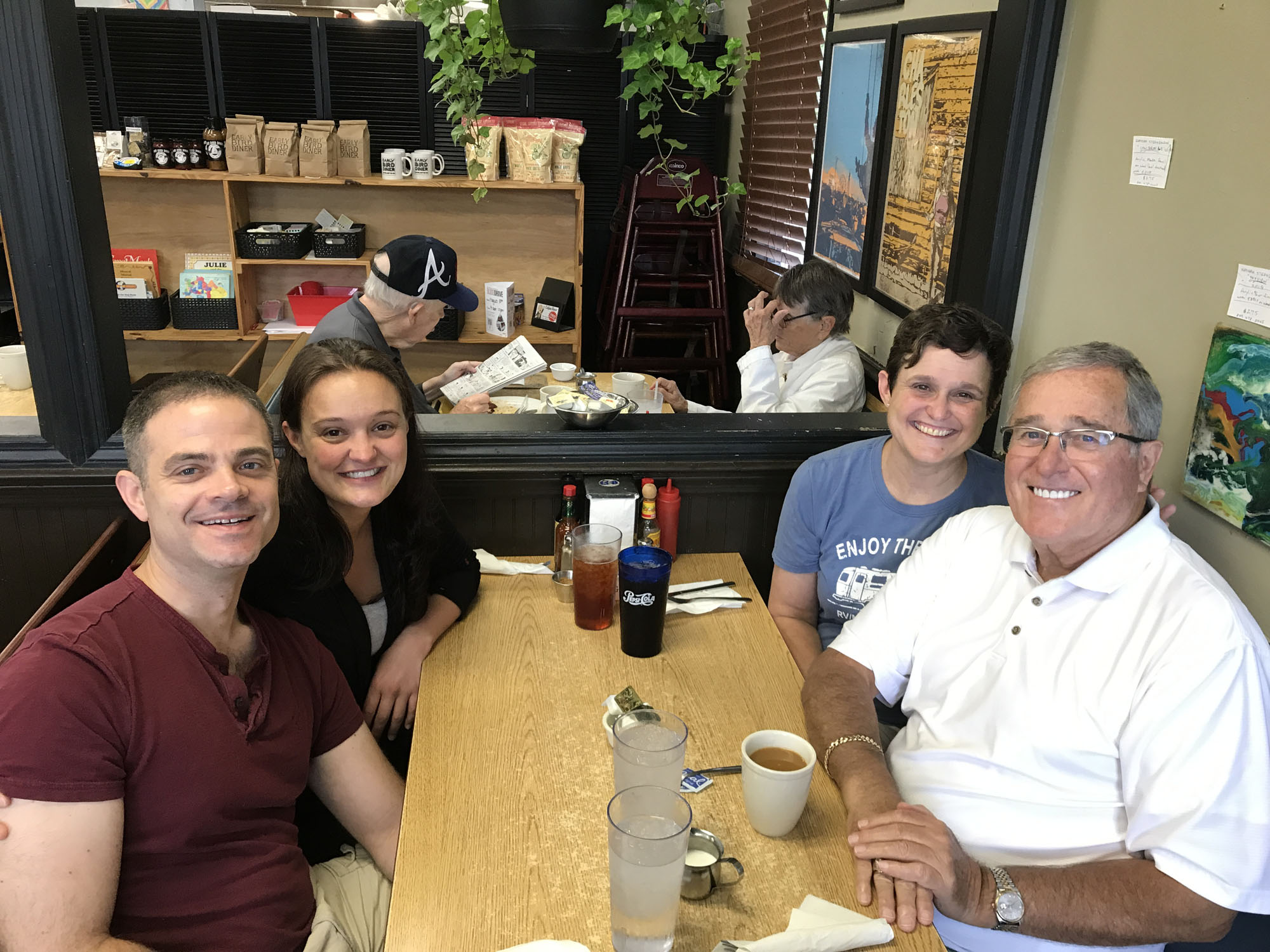 The morning of my birthday Dad checked out of his hotel and was driving to see my sister and her kids in Charlotte, but he wanted to take me to breakfast first.  Again I tried to pay but he was having none of it and we went to Jeremy and Kyrston’s favorite breakfast place called The Early Bird Diner.   They were thrilled to meet the baby and once again he slept through the entire meal.