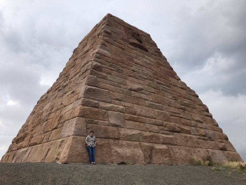 Next we stopped at a pyramid which was built by the railroads to honor two brothers who were instrumental in the transcontinental railroad being built.  This was NOT RV friendly as we had to go down a dirt road and there was no good place to turn around.  Once again, much more impressive up close. (I disagree. The road is a dirt road, but we’ve been on much much worse. There is room to turn around a rig at the location. Here is a sat shot of the parking lot. – Lee)