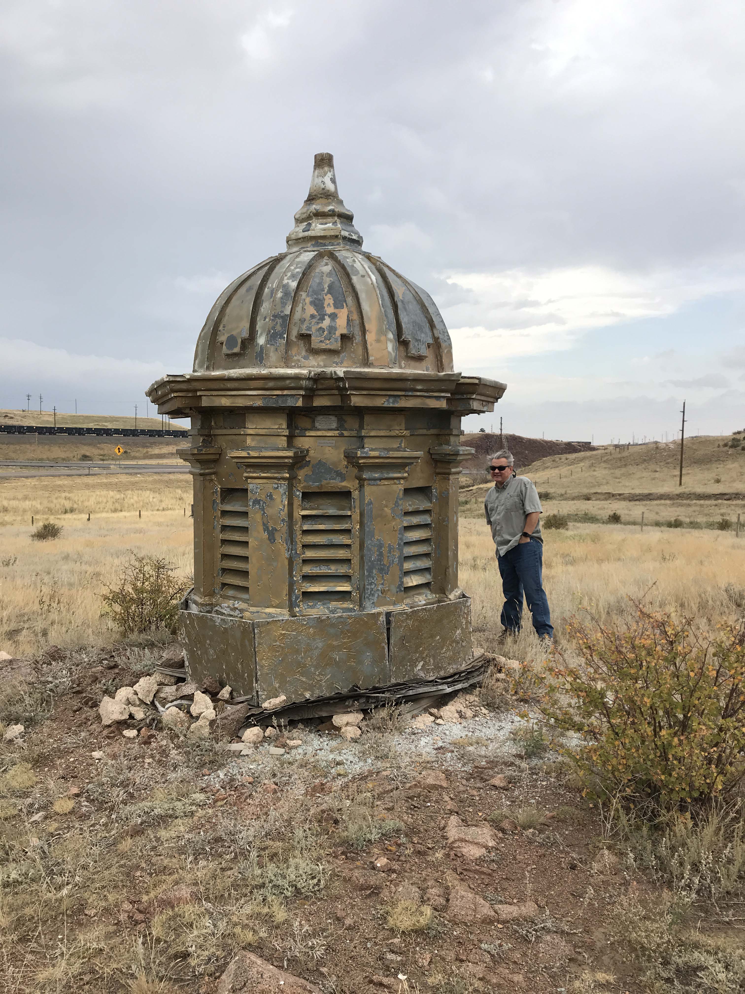 Lastly there was a field with the old top of the capital building.  This was not big rig friendly at all and we were even a little nervous driving the truck.  It was full of weeds and Lee said watch out for snakes before we got out of the truck.  That definitely made it less fun for me.  It was cool though to see how big the topper was.  Turns out, not as big as you would think. (Here you can see that there is NO room for a rig, but there’s plenty of room at the new school next door. And there’s a brand new fire station across the street that didn’t exist when this sat photo was taken. If you really wanted to see this and didn’t want to take any chances, the road has no traffic to speak of, so you could just pull over to the side at the bottom of the exit ramp, walk over to the site and then just continue back onto the highway. The original school is the small building to the left, just above the “218” and the smaller shape below it is the outhouse, and the dome is the small circle to the left of the old school- Lee)