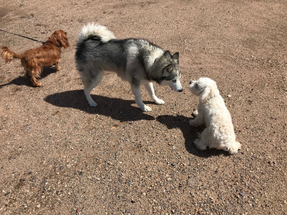 Everyone getting acquainted. Sammy is the ruby cavalier, Peyton is the beautiful Malamute, and Jack of course.