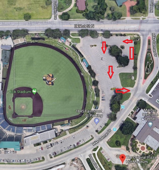 Really a great park and we took our time in the morning heading out. I only had one thing left that I wanted to do along our route in Texas and that was to see the original Pizza Hut. I have a real sentimental attachment to Pizza Hut from my childhood so when I learned they had started in Wichita and there was a small museum I wanted to stop. Thankfully Lee was game and we headed to the Wichita State University campus. As usual I looked at the satellite image and was pleased to see there was a huge stadium and parking lot across the street.