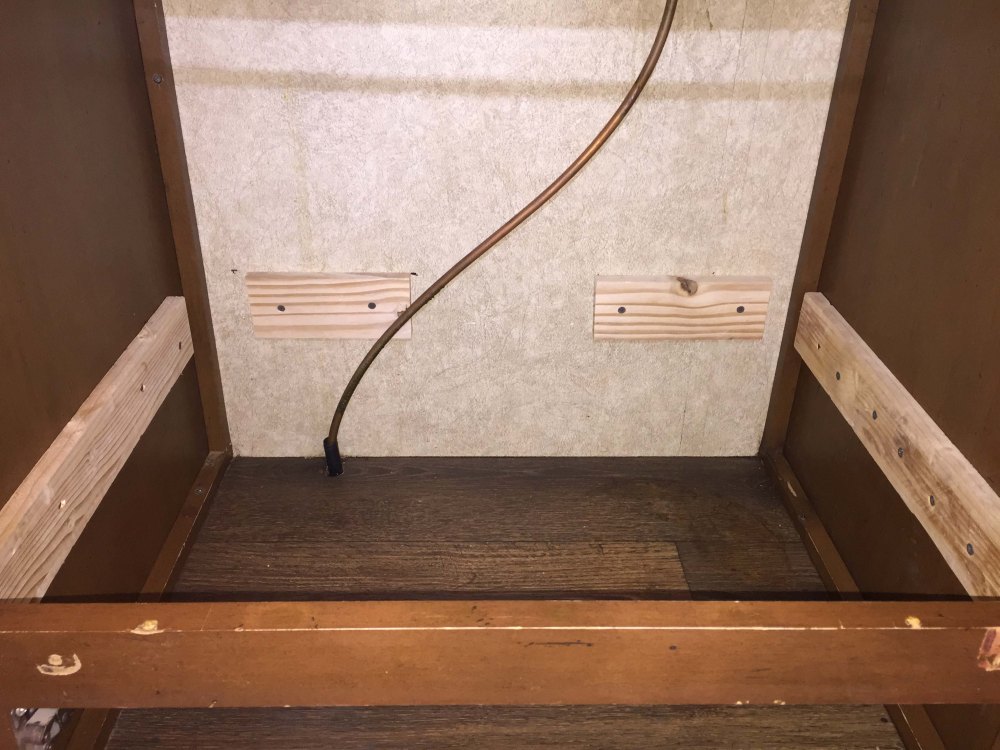 I used some small pieces of wood to create cleats for the shelf. I know it looks like I used a LOT of screws on the right side, but that panel is only a thin veneer, and there’s really no way to get to the other side to put in a backing plate, so I just put in a bunch of screws. The weight is distributed pretty well, so it will be fine.