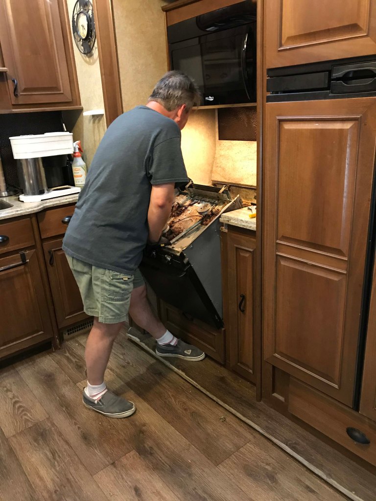 In any event, I am glad it worked out this way, because now that the remodel is done I am absolutely thrilled. I am using my convection oven (see previous post for how we replaced) to bake and cook and I still have a propane cooktop for when we boondock. I also have enough storage space for the air fryer, the instant pot, their accessories, and a new shelf for baking pans. Perfect! So here’s Lee’s step by step beginning with the all important step to burn off the propane in the lines before doing anything else! Oh and don’t judge me for how dirty it is. We have been using it for five years 🙂