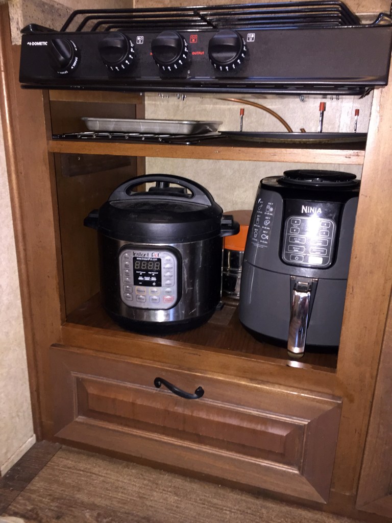 Still, it was what we had, and like many other things in an RV we learned to live with it, but things really came to a head when our friend Cori gave us an Air Fryer. Don’t get me wrong, we were thrilled to get it, but there was absolutely no place to make a permanent home for it. We were already moving our Instant Pot back and forth between the counter top and under the desk and the air fryer was one more thing we were constantly moving. When we realized that the space where the oven was would be the perfect space we were both sold!! One side note they came out with a combination Ninja pressure cooker/air fryer right after we got our air fryer. I hear they work great from friends, but I am not replacing mine until one or both break which will hopefully be awhile.