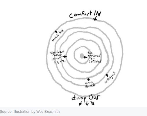 - Remember it’s not about you. Tell yourself that over and over again. It’s about the people closest to the person and everyone needs to put their grief away for a little while and take care of that family. There is a concept called The Ring Theory that I kept thinking of. Based on your proximity to the person who has died you comfort inward and dump emotion out. My sister, her husband, and their kids were at the epicenter. Everyone else was on the outside. I tried to take care of everyone in the center and had to let everyone on the outside of my ring go.