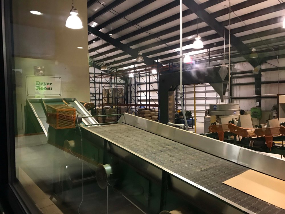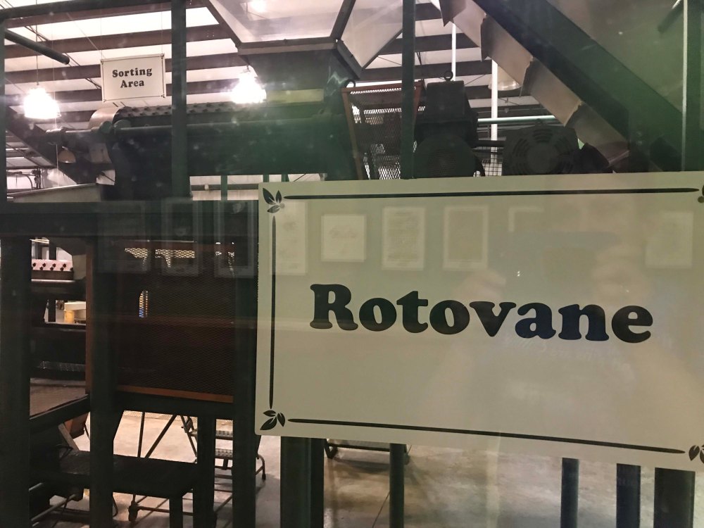 The tea comes into the wire mesh withering bed where it sits for 18 hours.  They process 5,000 pounds of leaves at a time and 12% of the moisture content is removed in this process.