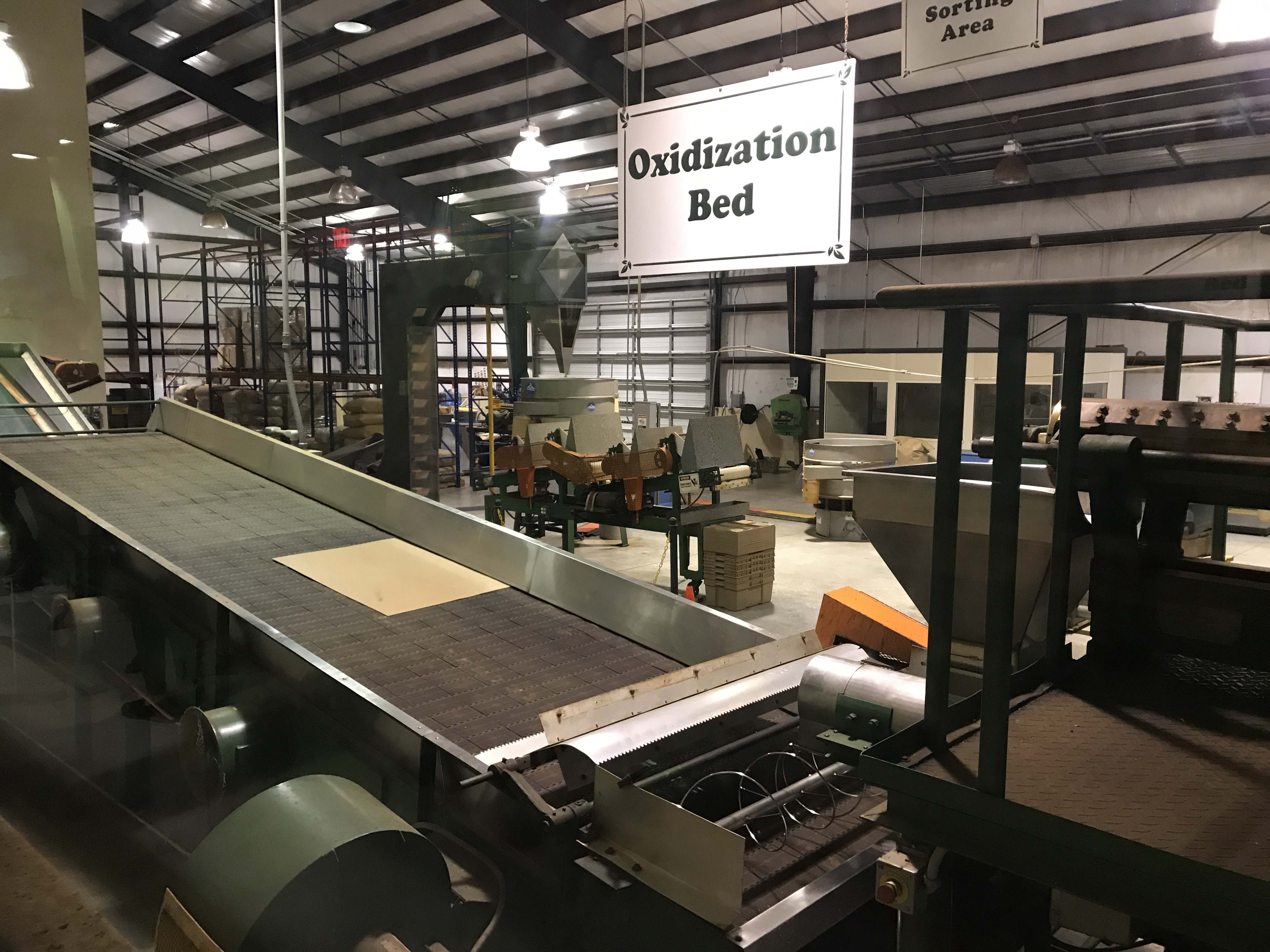 The tea comes into the wire mesh withering bed where it sits for 18 hours.  They process 5,000 pounds of leaves at a time and 12% of the moisture content is removed in this process.