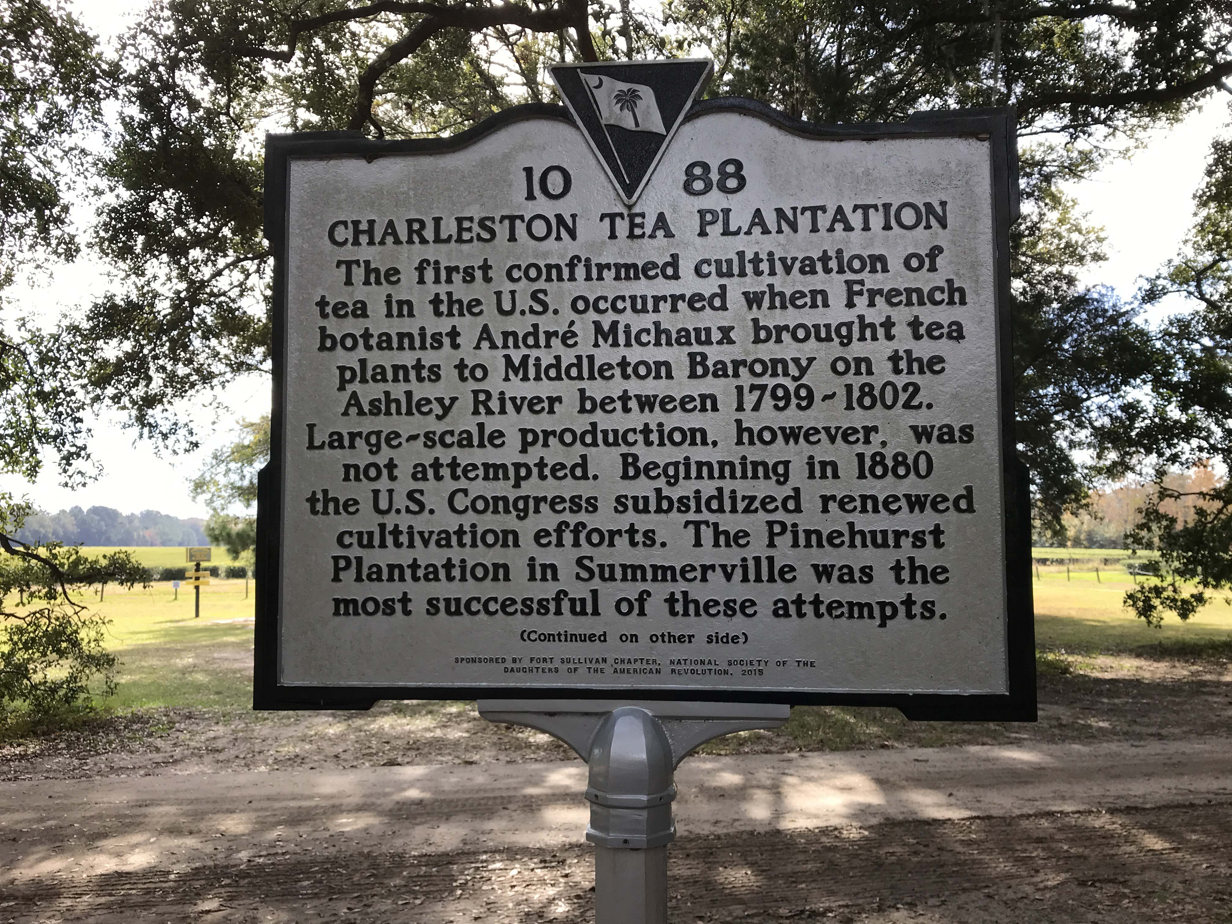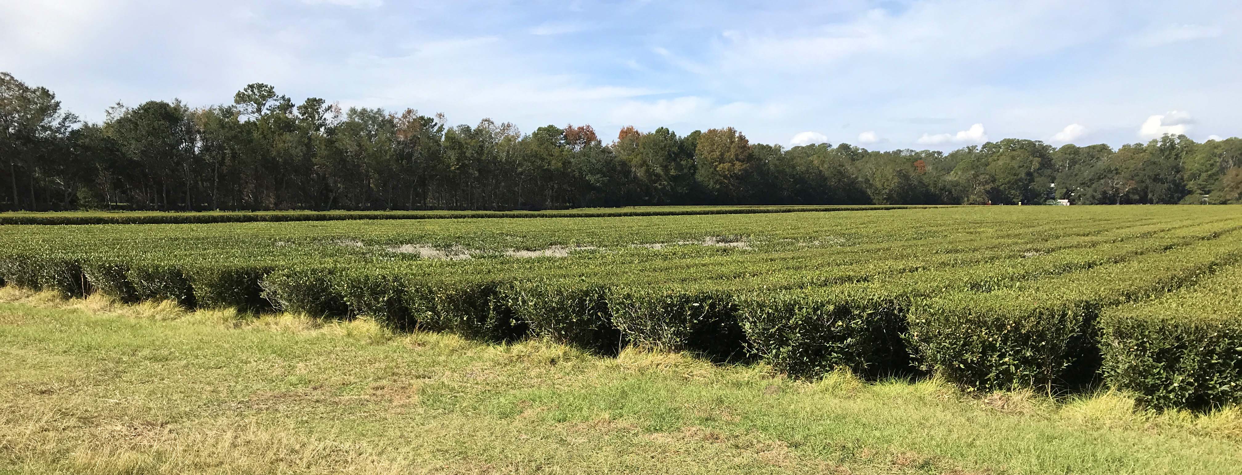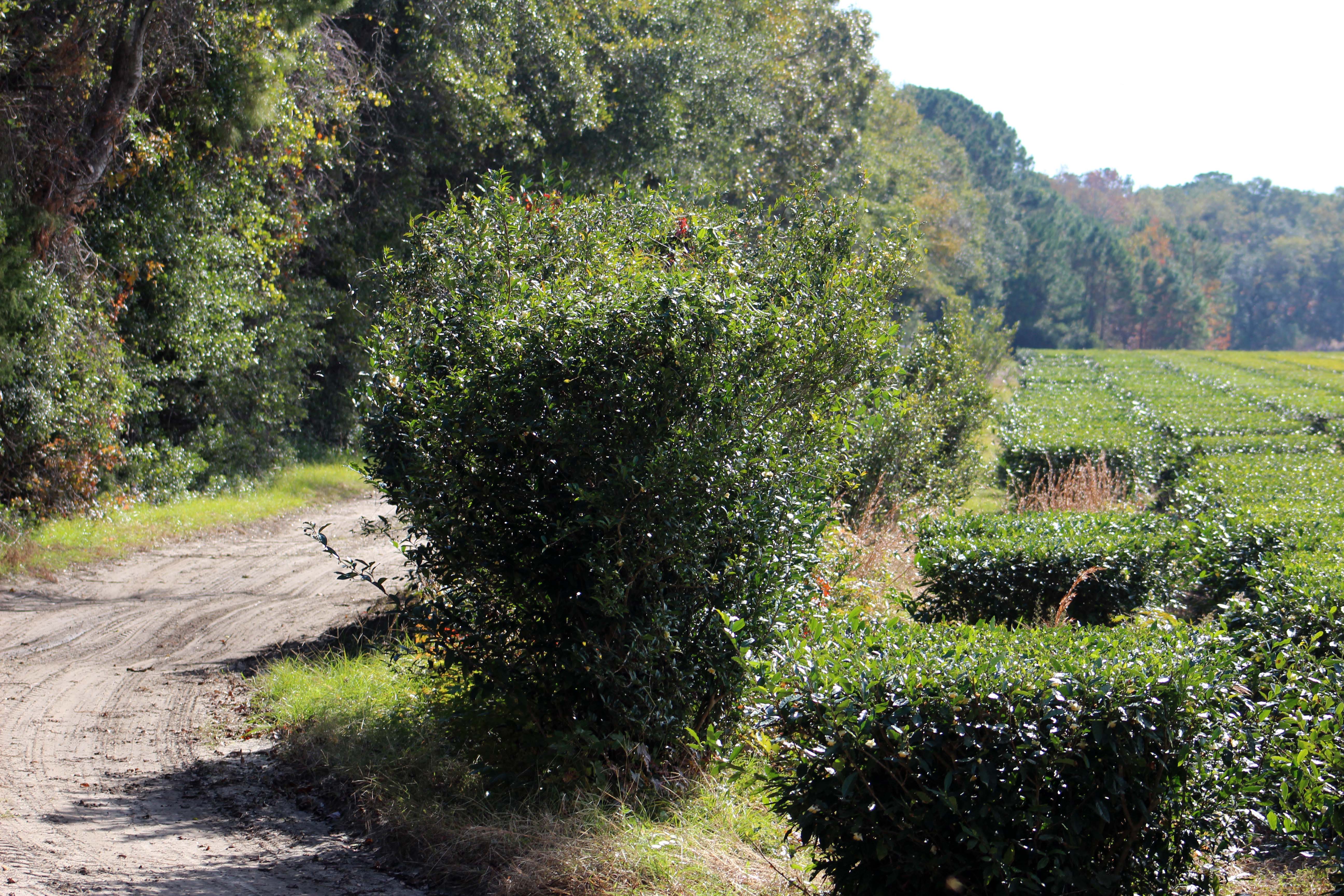 In the 1880s the Pinehurst plantation brought tea plants from China and grew them in South Carolina.  Eventually the plantation changed hands and the tea plants grew wild.  The weather here is  near perfect for the tea plants to grow, with lots of rain, heat, and sandy soil.  Tea is an evergreen plant and there are actually plants in China that are over 600 years old.  Since there are no insects or animals anywhere in the country that eat the leaves (they don’t like the caffeine) insecticides and fungacides are not needed.  The only reason tea didn’t completely take over like kudzu is that the root system is interconnected and it doesn’t like soggy roots.  Enough of the tea survived that in 1963 the Lipton Tea Company was able to grab some cuttings and transplant them to Wadmalaw Island.