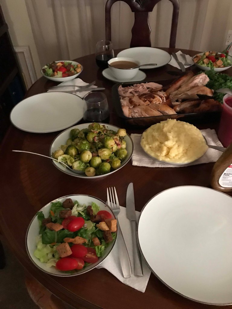 The meal was great and Oliver sat on my lap through most of it. He got to watch us all eat and we gave him a plastic spoon to chew on. My son-in-law Jeremy cooked and did a fantastic job. It was nice not having to worry about prep for once although I did wash the dishes.