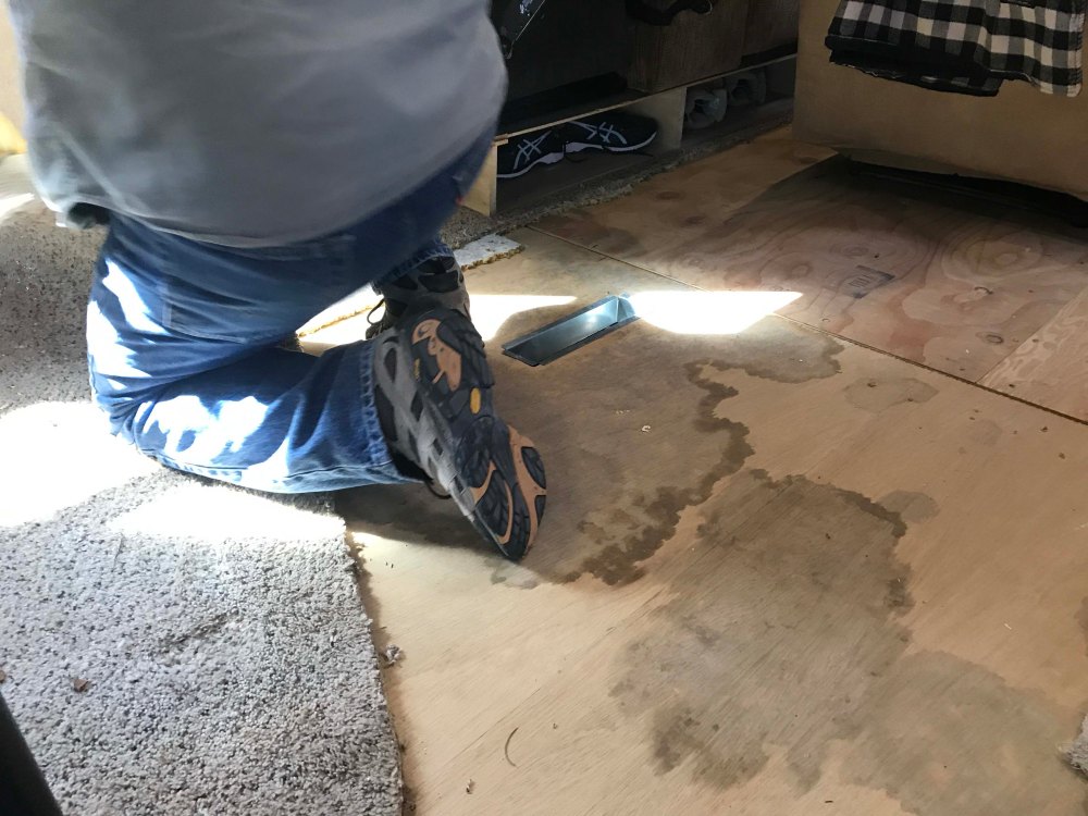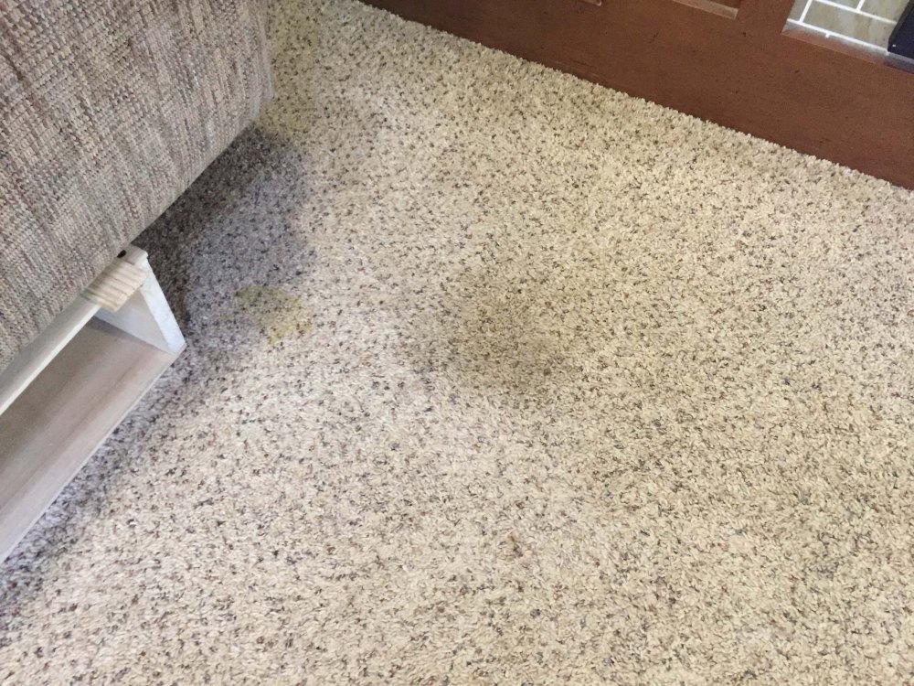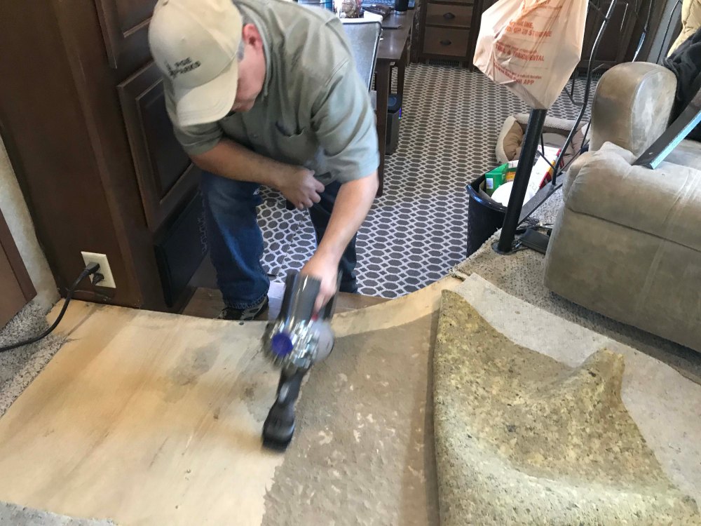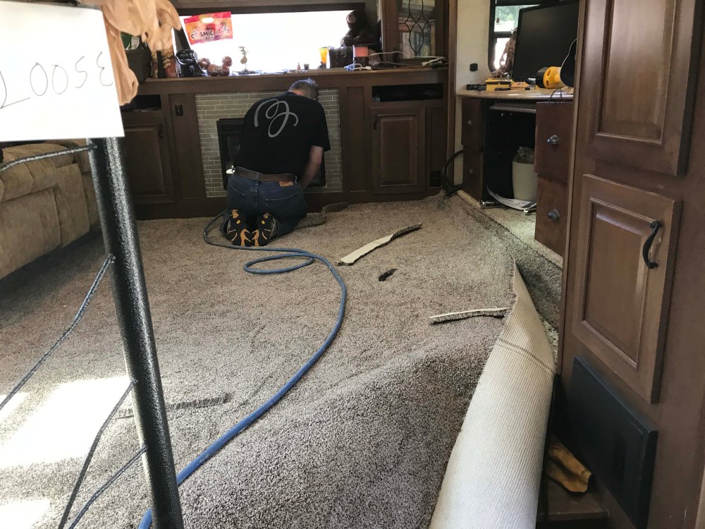 The next step in our five year face lift was the living room. This time Lee had more carpet to work with, but he still had to be careful because he also had the bedroom to do, and some detail work around a few slides. Again, he had to move everything up onto the couch or down into the kitchen and then he pulled up the existing carpet.
